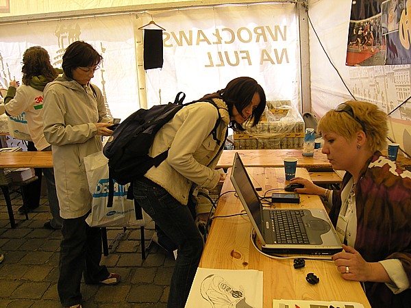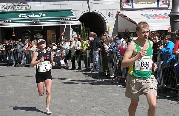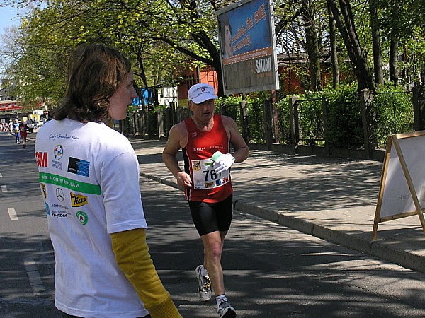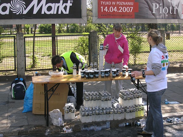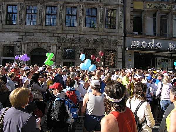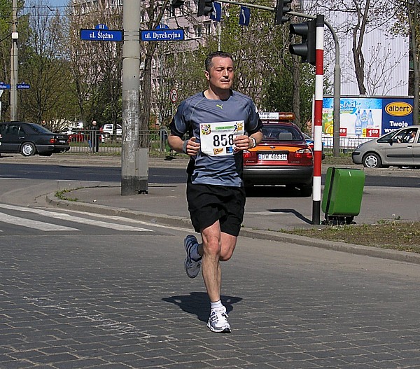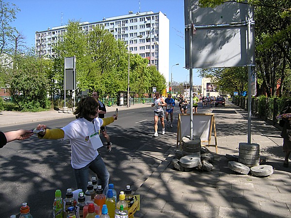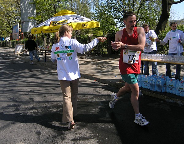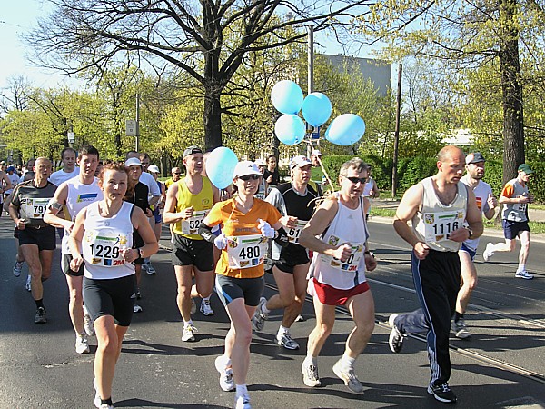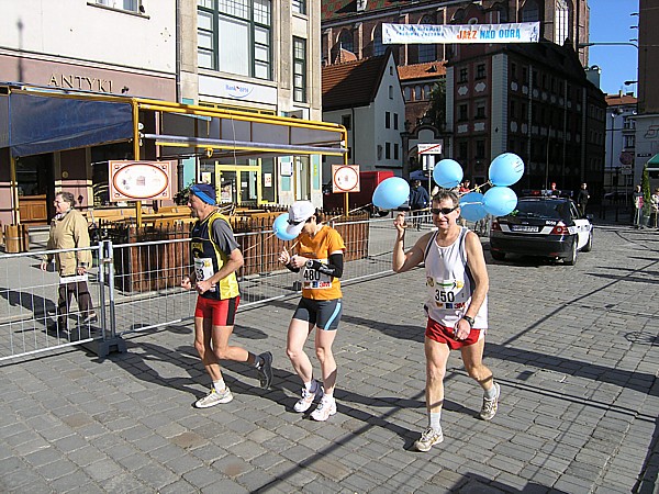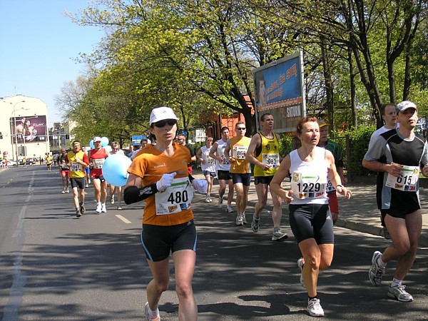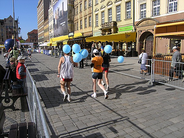 22.04.2007 r. Kolejny dzień rozpoczynamy dość sprawnymi przygotowaniami związanymi z dzisiejszym biegiem. Zestaw śniadaniowy, wybrany z 4. możliwych, odpowiada naszym oczekiwaniom pod względem diety maratończyka w dniu startu, jego godzina serwowania również, dlatego jemy śniadanie w hotelu. Niestety tuż po śniadaniu opuszczamy hotel wraz z całym naszym dobytkiem, którego część zostawiamy w bagażniku zaparkowanego nieopodal samochodu, resztę zaś zabieram ze sobą i oddaję do przechowalni przed startem. Ranek jest rześki, więc na nieodległy Rynek idę ubrana jeszcze w dres i kurtkę. Darek jest umówiony pod pomnikiem Fredy w Rynku z Jarzo, który ma mu pożyczyć rower, którym Darek będzie jeździł po trasie maratonu, obsługując głównie naszych kolegów klubowych biegnących po zwycięstwo. W tym czasie gdy Darek odbiera rower, ja robię rozgrzewkę razem z Jarkiem67 z Ochoty, którego spotykam przy koszach z odżywkami. Chwilę przyglądam się jakie specjały oddają do koszy z własnymi odżywkami na trasę inni zawodnicy; zauważam wśród kolorowych butelek różnej maści, podpisane numerem startowym banany. No cóż, w tym roku organizatorzy maratonu wrocławskiego powiedzieli zdecydowane „nie” dla bananów, stąd ta zapobiegliwość uczestników. Udajemy się na krótką rozgrzewkę, która pozwala na zdjęcie dresu, ale zaraz potem stajemy w miejscu gdzie świeci słońce, aby się już nie wychładzać. W kolejce do oddawania rzeczy do depozytu spotykam Andrzeja Radzymina, który zgłosił się jako oficjalny pacemaker do poprowadzenia grupy na czas 3 h 50 min. Krótka rozmowa z nim uzmysławia mi, że jeśli chcę uzyskać taki czas w dzisiejszym maratonie to powinnam mu pomóc w poprowadzeniu grupy lub zdać się wyłącznie na siebie. Andrzej daje mi więc jeden ze swoich kilku niebieskich baloników wypełnionych helem z napisem „3:50” i idziemy szybko na linię startu, gdyż za 8 min rozlegnie się strzał startera. Stajemy stłoczeni pomiędzy balonikami z czasem 3:40 i 4:00. Obok mnie stoi dziewczyna, przedstawiamy się sobie i okazuje się, że Marzena chce pobiec razem ze mną właśnie na wynik 3:50 (rzeczywiście będzie się trzymać obok mnie przez większą część dystansu). Chwilę po wypuszczeniu elity, ustawionej kilka metrów przed główną grupą, słychać głośny strzał, który jest sygnałem początku dla ok. 1200 zawodników, którzy stanęli na starcie dzisiejszego biegu. Z naszego miejsca do przekroczenia maty z pomiarem czasu, mija ponad 1 minuta. Biegniemy najpierw wokół Rynku, powoli i ostrożnie z uwagi na panujący tłok, jak również kostkę granitową na tym odcinku. Wybiegamy na szerszą ulicę, przebiegamy przez pierwszy most na trasie i wtedy można skorygować krok. Andrzej pyta czy biegniemy właściwym tempem i okazuje się, że od pierwszego kilometra udaje się od razu wskoczyć w to właściwe. Przez kolejne kilometry sprawdzam międzyczasy i podaję je głośno Andrzejowi, dla którego biegnięcie innym tempem niż zwykle jest pewnego rodzaju trudnością. Dodatkowo sprawdzam czas netto biegu wraz z rozpisanymi czasami co kilometr (korzystam z małej ściągawki, czyli kartki przymocowanej do małej plastykowej karty trzymanej w ręku). Ta metoda sprawdziła się już na poprzednim maratonie, a tutaj okazała się bardzo pomocna, bo dawała dodatkową informację, czy mamy zapas czasu, czy też spóźnienie, aby móc właściwie i szybko korygować tempo biegu. Kontrola czasu na mojej „karcie kredytowej”, łapanie międzyczasów co 1 km było teraz moim stałym zajęciem praktycznie do końca biegu. Okazało się, że nie tylko Andrzej, który już wiedział jakim tempem powinien biec, ale również współbiegnący domagali się tych informacji, pytając mnie o czas gdy mijaliśmy oznaczenia kolejnych kilometrów trasy. Tutaj muszę dodać, że oznaczenia kilometrów jak i cała trasa (punkty odżywiania i odświeżania) były zrobione perfekcyjnie: duże widoczne z dużej odległości tablice. Tak przynajmniej ja je oceniam z pozycji bardzo skupionej na ich obserwacji osoby. Wypatrywałam bowiem ich dużo wcześniej, tak aby w odpowiednim momencie albo podać głośno czas i tempo biegu, albo wypatrzeć podawaną do ręki przez wolontariuszy obsługujących punkty odżywkę, czy kubeczek z piciem. Jednym słowem te wszystkie czynności wypełniały mi czas na tyle, że wyjątkowo kilometry mijały jak szalone. Cały czas czułam się bardzo dobrze, cały czas biegłam, minimalnie zwalniając tylko na punktach, wtedy odzywał się ustawiony na odpowiedni zakres tempa zegarek. Jego wolne pikanie natychmiast podrywało mnie do przyspieszonego biegu. Biegnący obok kontrolowali razem ze mną czy tempo jest właściwe i w pewnym momencie zdałam sobie sprawę, że ten niewinny lekki niebieski balonik na wstążce w moim ręku jest ciężkim brzemieniem odpowiedzialności ciążącym na moich barkach, a ściślej mówiąc na moich nogach. Nie mogłam sobie pozwolić na żadne zwolnienie w tempie biegu. Andrzej Radzymin ze swoimi kilkoma balonikami w tym samym kolorze biegł tuż za mną, a ja jak wysunięty satelita nadawałam pomocnicze tempo będące wskazówką dla niego i reszty grupy. „Karta kredytowa” pełniąca rolę ściągawki do kontroli międzyczasów była „ustawiona” na czas końcowy 3:49, a my przybiegaliśmy na każdy z kolejnych kilometrów z dodatkowym zapasem od ok. 1 min do 40 sekund. To było bardzo motywujące. Pewną monotonię biegu przerywały atrakcje, które na nas czekały po drodze. Był to albo fragment trasy wytyczony po szutrowej drodze, gdzie wzbijający się spod stóp biegaczy kurz wyznaczał właściwy tor, a zakręty pod kątem 90 stopni dodatkowo urozmaicały trasę. Byliśmy również świadkami rodzinnego sposobu dopingowania: grupy dorosłych z dziećmi w różnym wieku, każdy uderzający łyżką o garnek. Zdarzały się też miejsca gdzie 