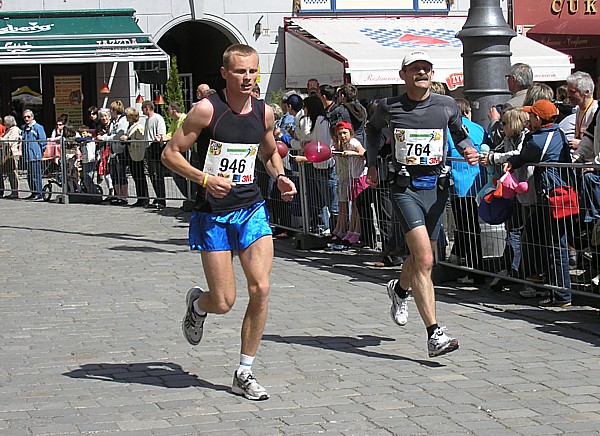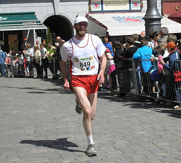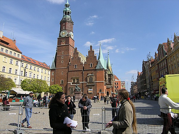 Odmienność startu we Wrocławiu była również związana z możliwością spotkania na żywo z e-trenerem, czyli Darkiem Sidorem, a ściślej mówiąc z Darkiem i Kasią Sidorami. Po odbiorze pakietów startowych, wspólnym z naszymi kolegami, obiedzie i później deserze w stylowych wnętrzach kawiarni na Starówce, udajemy się do naszych miejsc noclegowych: my do szczęśliwie wcześniej zarezerwowanego hoteliku 200 m od Rynku, a koledzy do oddalonego o 3,5 km innego hotelu, ale z dogodnym dojazdem tramwajem. Wieczorem idziemy na Pasta Party gdzie spotykamy jeszcze Jurka Skarżyńskiego i oczekujących na nas Kasię i Darka Sidorów. Rozmawiamy wspólnie przy makaronach, wreszcie gdy zimno nie pozwala dłużej siedzieć pod parasolami na Rynku, przenosimy się do pobliskiej kawiarni. Tutaj jednak zbyt hałaśliwe dźwięki wydobywające się z głośników przeszkadzają w konwersacji, dlatego gospodarze proponują spacer po wrocławskiej starówce. Okazuje się, że to był bardzo dobry pomysł, gdyż dzięki temu poznajemy urokliwe miejsca Wrocławia. Najpierw szukamy wrocławskich krasnali, których obecności nigdy byśmy nie byli świadomi, gdyż trzeba dokładne wiedzieć gdzie szukać tych małych przycupniętych figurek. Podobnie jak nie trafilibyśmy w inne ciekawe miejsca Starówki, np. omijaną szerokim łukiem przez wegetarian ulicę o nazwie Jatki. Idąc w kierunku Ostrowia Tumskiego przechodzimy obok siedziby Uniwersytetu Wrocławskiego. Podążając dalej i przechodząc pieszo kolejne mosty przez rozliczne kanały jakie tworzy Odra ma się wrażenie przebywania w nowoczesnym europejskim mieście. Wszędzie jednak patrzą na nas historyczne miejsca: mijamy po drodze wiele zabytkowych kościołów, kamienic i wreszcie nasz spacer kończymy tuż przy Rynku pod drzwiami naszego hotelu. Przez cały czas nasi gospodarze sypią jak z rękawa wiadomościami historycznymi na temat odwiedzanych miejsc. Wieczorna przechadzka pomaga nam w szybkim zaśnięciu w nowym miejscu, co jest szczególnie ważne z uwagi na jutrzejszą wczesną pobudkę. Hotel usytuowany przy małej wąskiej uliczce okazuje się być trafnym wyborem, gdyż wokół nie słychać zgiełku miasta i sen przychodzi bardzo szybko. |