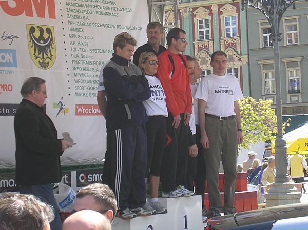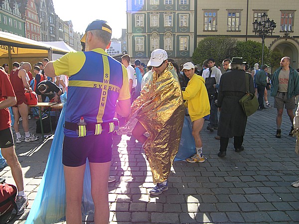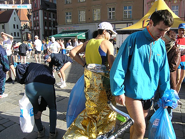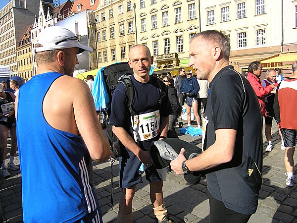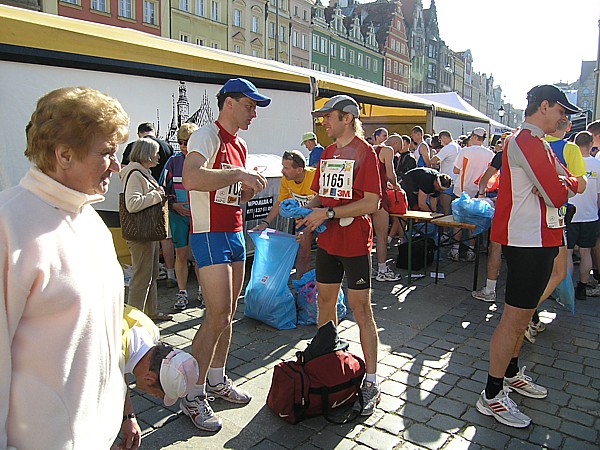 Maraton we Wrocławiu był dla mnie niezwykły i odmienny pod wieloma względami. Przede wszystkim po raz pierwszy startowałam w maratonie w innym mieście (do tej pory dwa razy wybiegałam na start prosto z domowych pieleszy), więc dochodziła kwestia organizacji związanej ze sprawnym dojazdem. Tutaj zadanie bardzo ułatwiał fakt, że jechaliśmy autem gdzie kierowcą był Darek, można więc było się skupić tylko na rozmowie, podziwianiu widoków za szybą oraz uzupełnianiem węglowodanów w różnej postaci. Jako współpasażerów mieliśmy nadzwyczaj miłe towarzystwo w osobach trzech doświadczonych biegaczy: Wojtka (oursa), Sylwka oraz Darka Rosy, który jako jedyny nieklubowicz, na czas startu we Wrocławiu przyjął barwy Entre.pl Teamu. Trzej nasi koledzy stłoczeni nieco na tylnym siedzeniu samochodu, zdawali się jednak być zadowoleni z takiej możliwości transportu, a Darek jechał bez zbędnej nonszalancji dla życia swoich pasażerów oraz stosując się bardzo dokładnie do zalecenia samego Prezesa klubu przysłanego sms-em: „Darku, jedź ostrożnie, wieziesz elitę.”