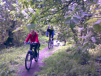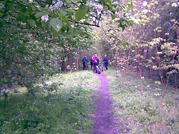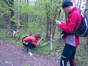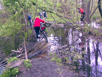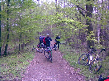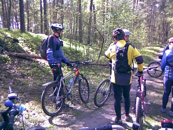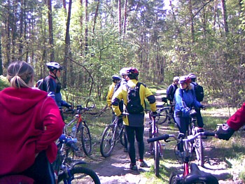 Święto 1-majowe postanowiliśmy spędzić z grupą przyjaciół i znajomych na rowerach w Puszczy Kampinoskiej. Było to bardzo dobre posunięcie z wielu powodów: dzień zapowiadał się słonecznie i sucho, lecz chłodno, a wieczór nawet w okolicach 0 st., więc wyjazd na kajaki byłby pomysłem chybionym. Rowery natomiast sprawdziły się doskonale. Również przyroda nas nie zawiodła: bajeczny las z soczystą zielenią i kwitnącymi jeszcze w podszyciu wiosennymi kwiatami, a komary zupełnie nieobecne. Najpierw pokonaliśmy Mariewskie Łąki - trasa nie była tutaj bardzo wymagająca, tylko w dwóch miejscach trzeba było przenieść rowery, resztą ścieżki, w miarę suchą, dało się swobodnie przejechać. Później Wierszowską Drogą udaliśmy się w kierunku Roztoki, mijając po drodze cmentarz wojenny. Ciągle trudno było się rozgrzać, a w pewnym momencie ktoś zauważył płatki śniegu, co tłumaczyło temperaturę powietrza. Po krótkim postoju obok baru w Roztoce ruszyliśmy zielonym szlakiem malowniczą drogą w lesie, która doprowadziła nas do Sosny Powstańca. Stamtąd pofałdowanym terenem (Rezerwat Karpaty) wróciliśmy do znanego baru w Roztoce. Pętla prowadziła przez wiele wzniesień, a niektóre z nich trzeba było pokonywać (zwłaszcza zjazdy) z dużą uwagą. Na trasie czekał na nas w wielu miejscach piach co było dodatkowym utrudnieniem, bo koła zakopywały się w głębokim piasku i trzeba było rower prowadzić. Po przejechaniu Karpat popas był nieco dłuższy, gdyż uczestnicy wycieczki byli już nieco zmęczeni. Przed nami ostatni odcinek do przejechania: tylko kilka km powrotu do miejsca startu, czyli bazy na działce naszych dzisiejszych gospodarzy, czyli Ewy i Bartka. W sumie pokonaliśmy w dość trudnym i urozmaiconym terenie dystans ok. 40 km. Pomimo licznych przerw na dożywianie po drodze, apetyty po takiej wycieczce dopisywały i nie mogliśmy się doczekać na grillowane specjały. Wieczorem dotarł do nas również Andrzej (entre), który co prawda nie brał udziału w części rowerowej, ale zjawił się na zakończenie imprezy i uwiecznił jej uczestników na zdjęciach.