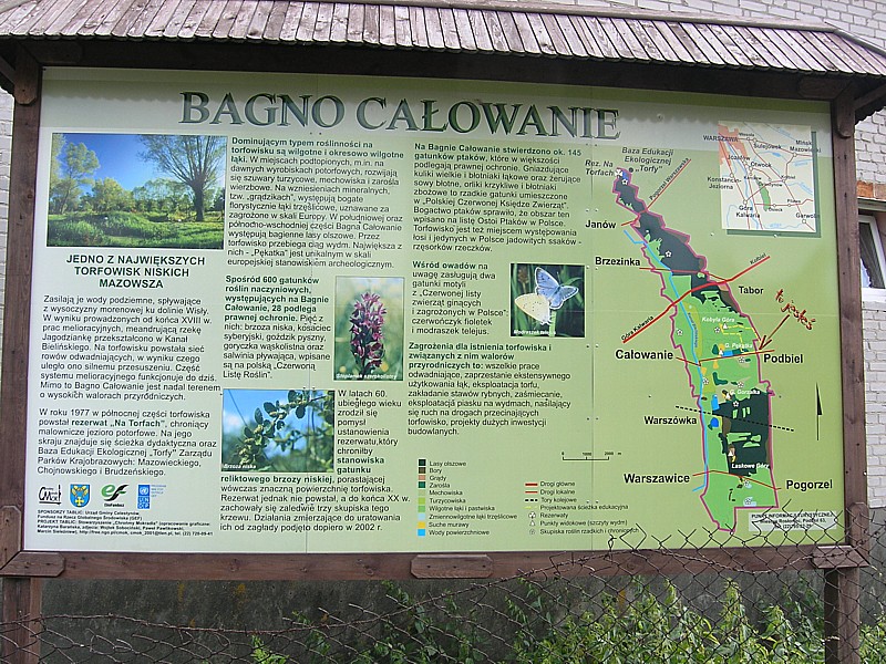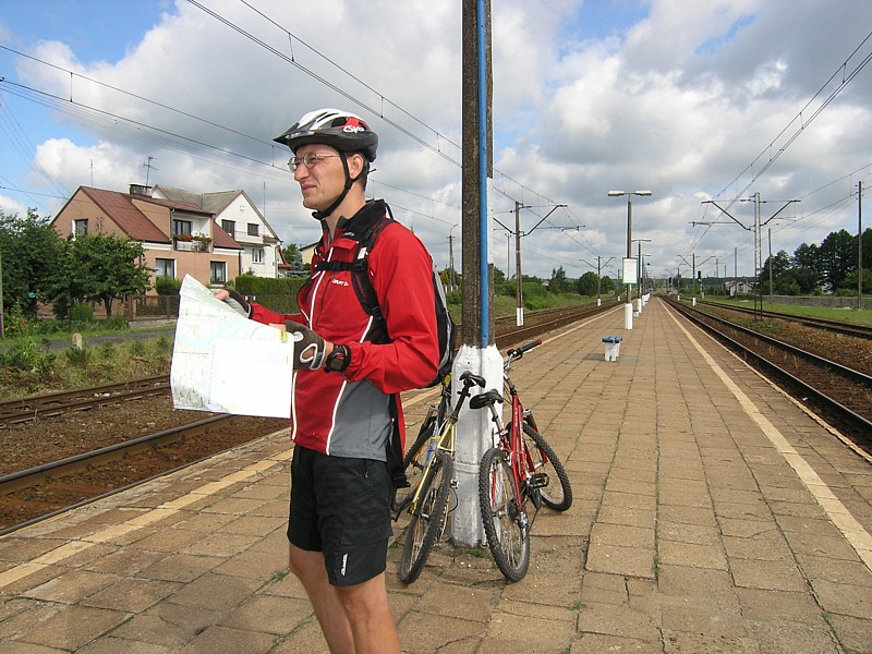 Po przerwie regeneracyjnej, na którą w pełni zasłużyliśmy po przygodzie na łąkach przy Sobieniach, pedałujemy żwawo asfaltową drogą prze wioski Warszówka i Całowanie. Ten fragment trasy wydaje się nam okropnie dłużyć swoją monotonią. Dlatego z chęcią znów skręcamy z głównej drogi w prawo na piaszczystą drogę. Droga jest dziwnie szeroka i prowadzi najpierw przez mostek, potem omija wieś Pękatka i prowadzi do miejsca wydobywania torfu. Przed Podbielą mijamy bardzo ciekawe miejsce z tablicami informacyjnymi na temat torfowiska niskiego, jego znaczenia i walorów przyrodniczych roślinności torfowej. Krótki postój w sklepie w Podbieli gdzie jest czas na deser w postaci lodów i jedziemy do Ponurzycy. Droga prowadzi po prawie górzystym terenie. Różnica wzniesień na tym krótkim odcinku jest, jak na mazowieckie warunki, dość znaczna. Spotykamy tutaj trzech kolarzy, którzy trenują podjazdy. Najpierw widzimy ich zjeżdżających w dół uśmiechniętych i pozdrawiających nas, a za chwilę wyprzedzili nas na podjeździe z jeszcze szerszym uśmiechem. Do Ponurzycy jedzie się w dół i przejeżdża przez Rynek (to nazwa kolonii). We wsi można zobaczyć jeszcze domy kryte strzechą. Zagaduję jedną z kobiet, która trzymała w ręku litrowy kubek jagód. W trakcie rozmowy zauważamy, że oprócz dłoni, ma także fioletowe zęby i język. Przyznaje się, że zjadła drugie tyle jagód podczas zbierania w lesie i śmieje się tłumacząc jak trafić na dobre miejsce do zbierania jagód i grzybów. Jedziemy dalej drogą prosto i wjeżdżamy do lasu, ale nie mamy już ochoty na jagody. Mijamy po drodze wiele leśnych kapliczek i wreszcie osiągamy Zabieżki by znaleźć stację kolejową z nadzieją, że będzie zaraz jakiś pociąg. Kasa biletowa mieszcząca się w małej metalowej budce jest zamknięta, peron zarośnięty trawą, ale z rozkładu jazdy na tablicy wynika, że za ok. 20 min powinien być pociąg do Warszawy. Marzy mi się, żeby pociąg zawiózł nas prosto pod drzwi domu. Mamy teraz już na liczniku ponad 60 km, razem z błądzeniem po łąkach, wolę dlatego nie myśleć o tym, że ze stacji w Aninie będziemy mieli jeszcze dodatkowe 6 km, które będą do pokonania na rowerze. Pociąg przyjeżdża punktualnie i wita nas ten sam konduktor z sumiastymi wąsami co rano. Poprawia mi to nieco humor, zawsze to miło spotkać kogoś dwa razy w ciąga dnia.
