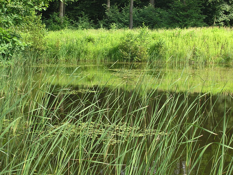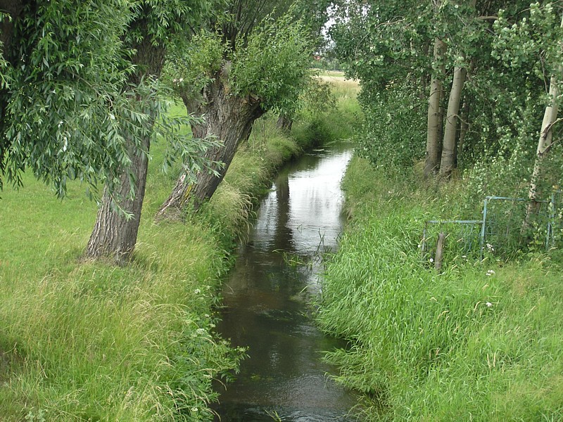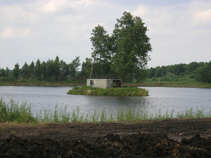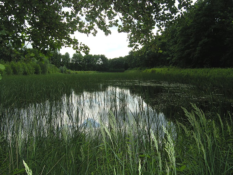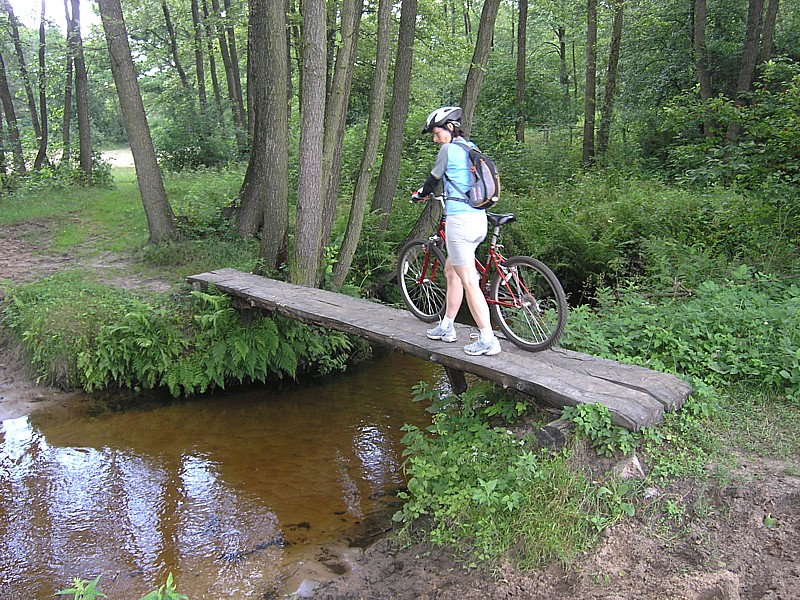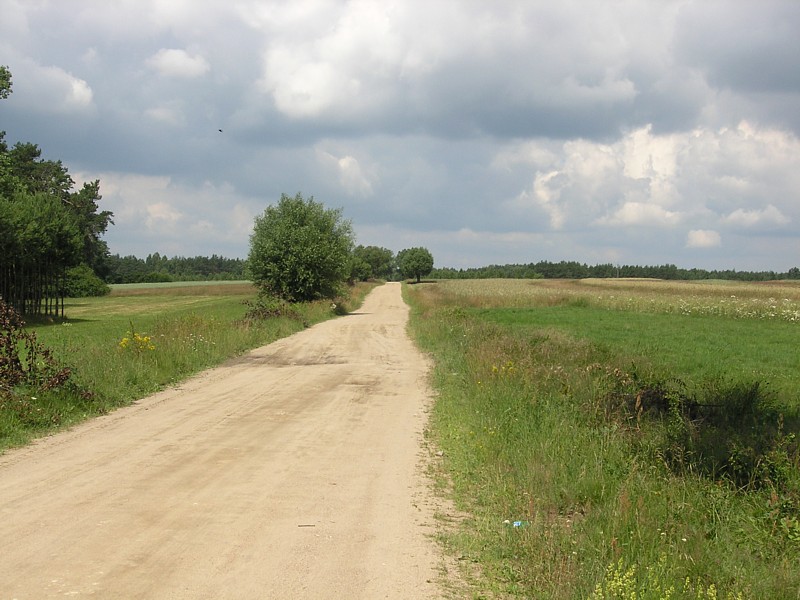 Na stacji w Garwolinie byliśmy tylko we dwoje na pustym peronie, po odjechaniu pociągu otoczyła nas wokół niesamowita cisza. Staliśmy tak chwilę nieco otumanieni, w końcu ruszyliśmy. Najpierw kierując się na zachód asfaltową drogą biegnąca w lesie w kierunku do Huty Garwolińskiej. Później skręciliśmy w drogę, która była kiedyś traktem (równo ułożone duże kamienie polne). Początek leśnego duktu wyznacza drewniana brama będąca zaproszeniem na ścieżkę przyrodniczo-kulturową. Co jakiś czas pojawiają się tabliczki informujące o stanowiskach roślinności lub występującej tu faunie. W pewnym momencie ścieżka skręca w prawo, a my kierujemy się dalej prosto. Jednak niespodziewanie w poprzek naszej drogi napotykamy na głęboki, szeroki rów, który uniemożliwia dalszą jazdę. Przez chwilę waham się nawet, że może uda się go jednak przeskoczyć. W końcu jednak wracamy i kontynuujemy naszą wycieczkę ścieżką przyrodniczą. Zaprowadza ona nas do bardzo urokliwego stawu, gdzie spędzamy chwile na podziwianiu odbicia chmur w gładkiej toni wody, słuchaniu śpiewu ptaków i rechotaniu żab. Ścieżka szczęśliwie po zatoczeniu łuku, wraca do naszej głównej drogi, którą kierujemy się do szosy. Teraz skręcamy, tak jak pokazuje znak drogowy, na Starą Hutę.