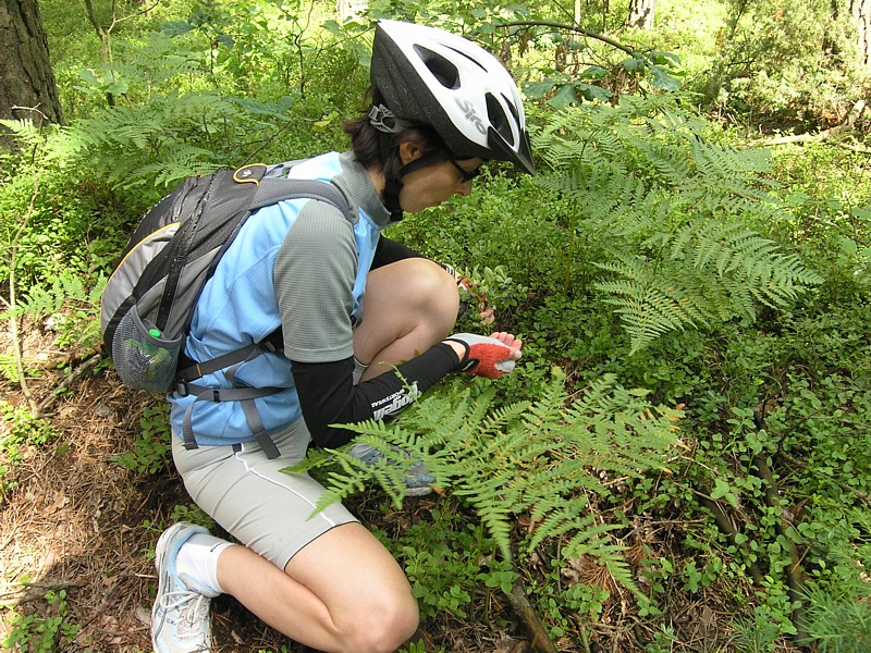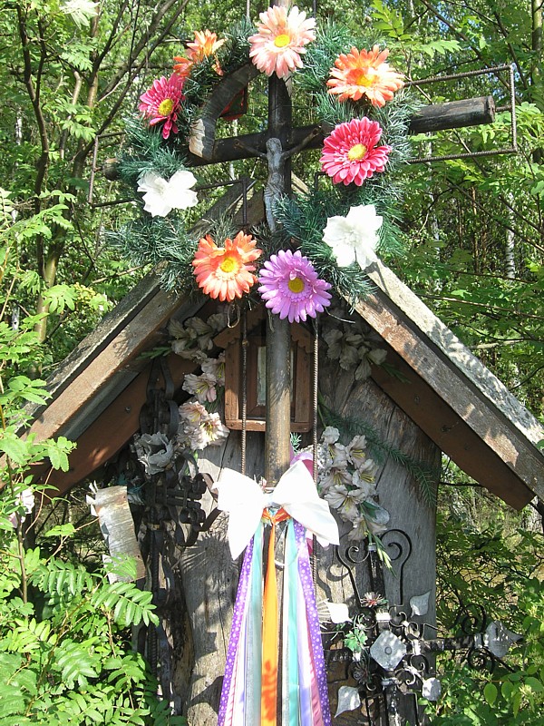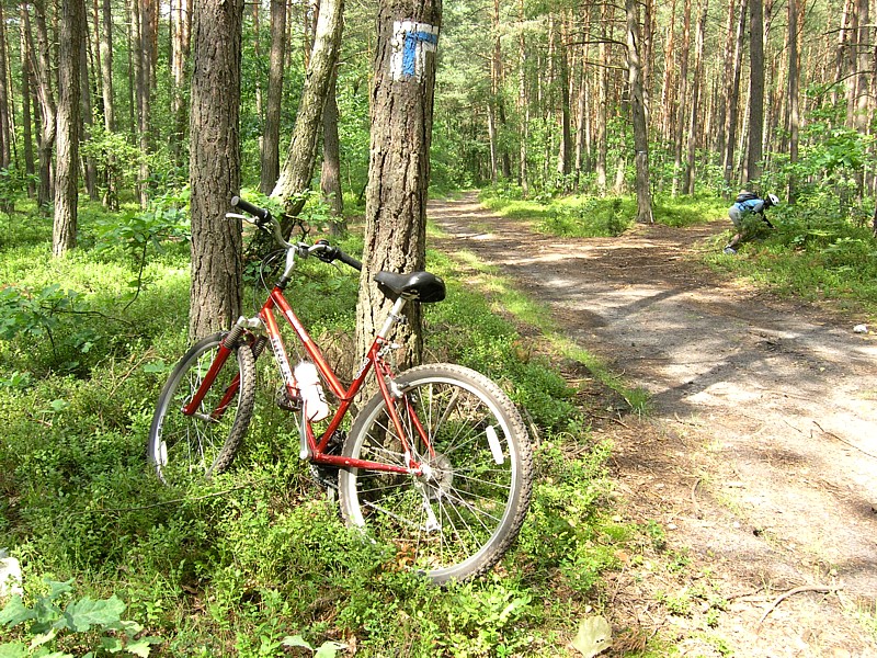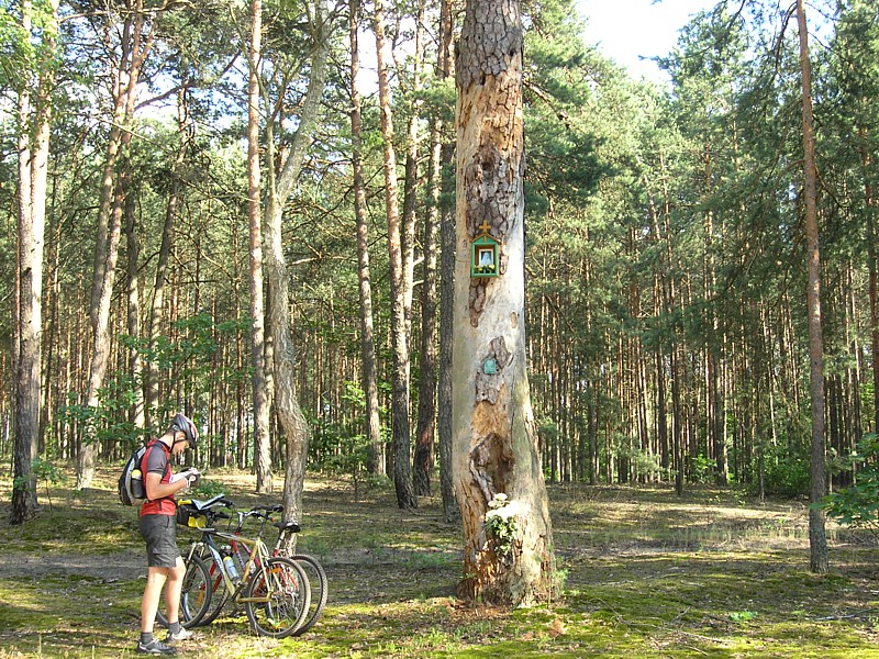 Po ostatniej udanej wycieczce rowerowej w ubiegłą niedzielę, Darek zaplanował kolejną, tym razem dalej od Warszawy, z dojazdem pociągiem do Garwolina i powrotem z Zabieżek. Rozpoczął nawet poszukiwania partnera do tej wycieczki, ale ponieważ tak się złożyło, że ja miałam wolną niedzielę, więc zaprosiłam Darka z okazji Jego urodzin na przejażdżkę po mazowieckich rozległych łąkach i toast ze źródełka mineralnego w Osiecku. Zamiast tortu był torf, ale oczywiście nie do jedzenia, tylko do podziwiania, a było co, bo torfowiska były bezkresne. Mijaliśmy dworek Potockich gdzie podałam drugie śniadanie, a resztę węglowodanów uzupełnialiśmy zaopatrując się w wiejskich sklepikach i jedząc jagody w lesie. Podziwiamy liczne przydrożne i leśne maleńkie kapliczki zawieszone na drzewach, leśne uroczyska i błąkamy się pośród łąk oraz na bagnie Całowanie. Wybawiła nas z opresji mapa i kompas oraz spokój.