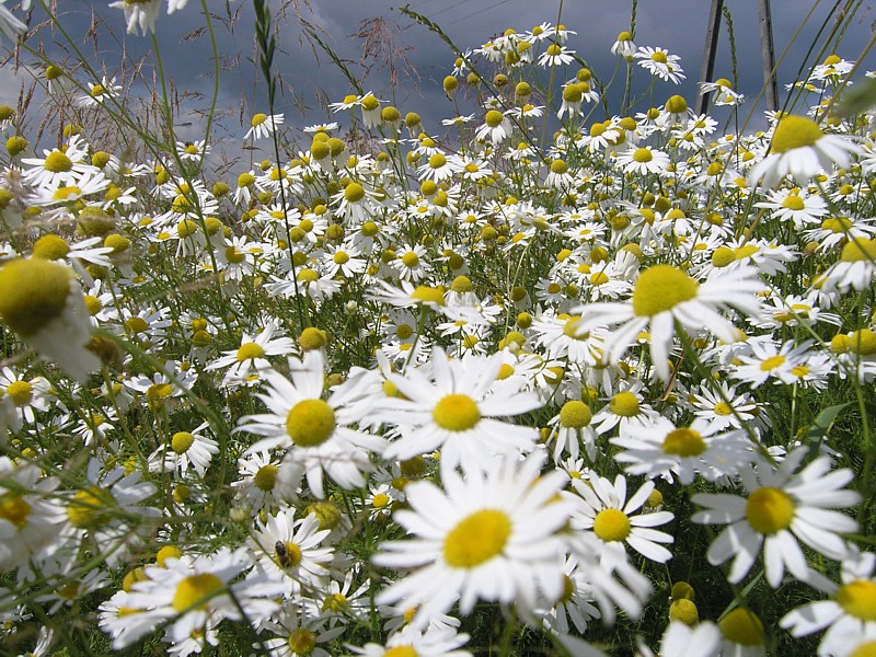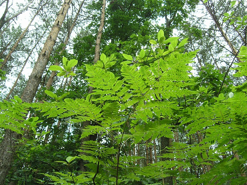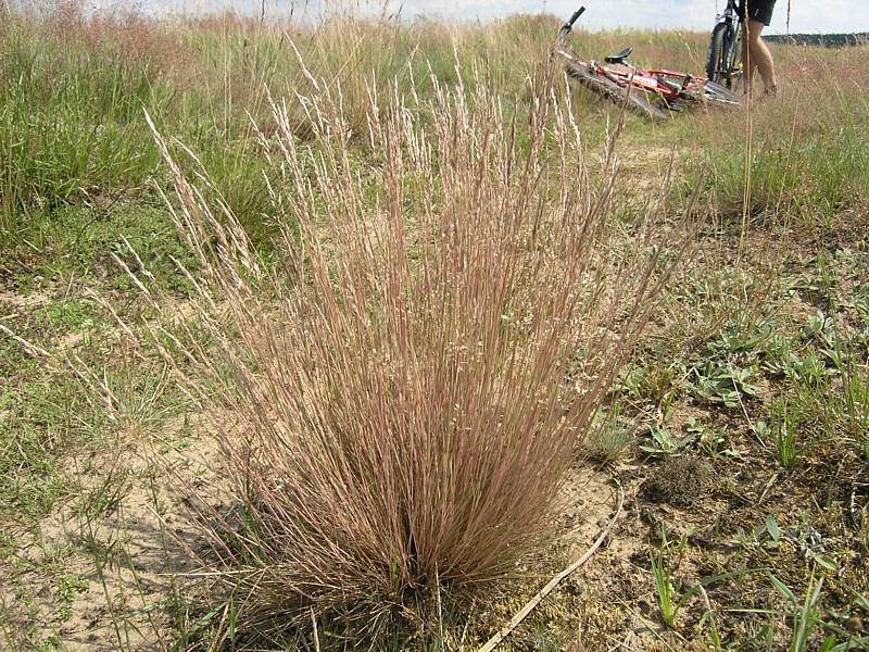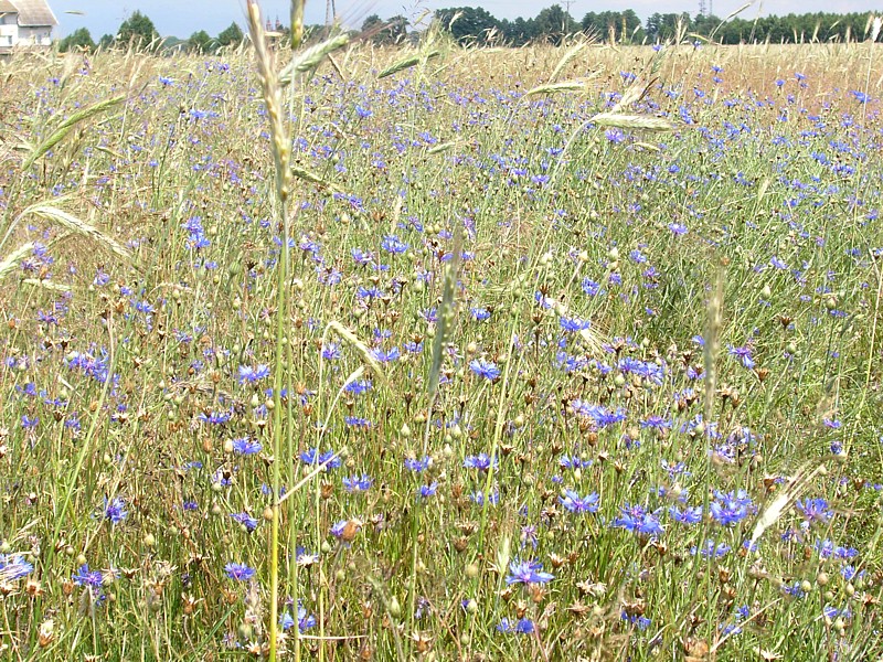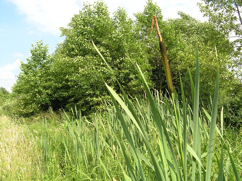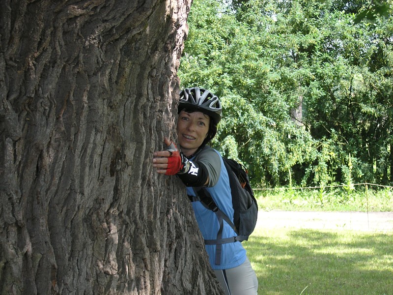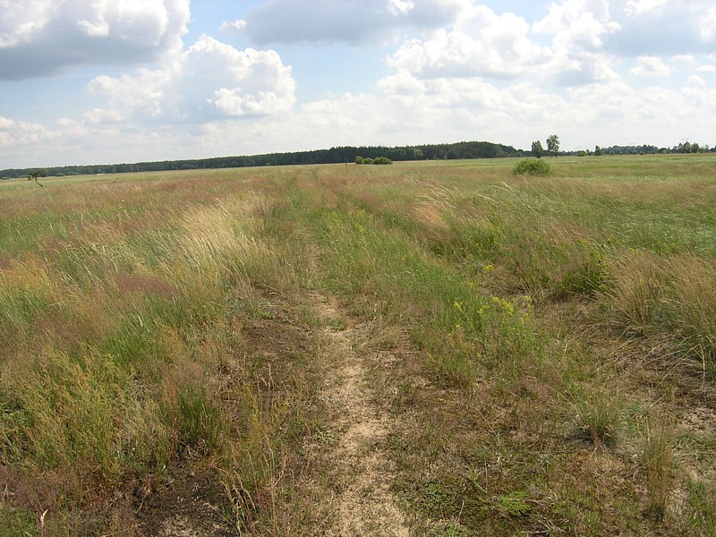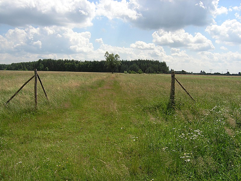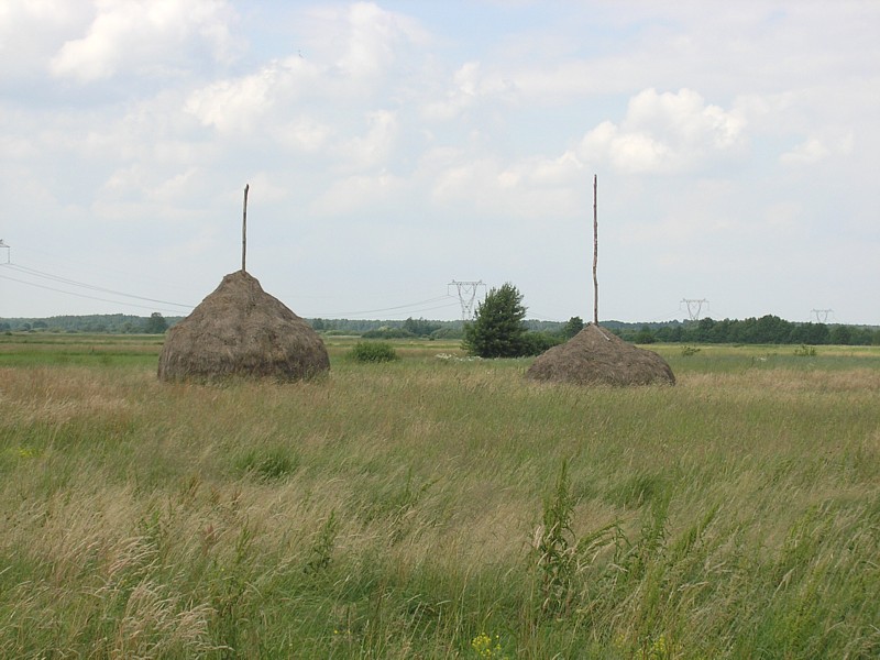 Z Osiecka wyjeżdżamy kierując się do Sobieni-Jezior. Mijamy Sobienki i skręcamy w leśną drogę, która doprowadza nas do Rezerwatu Wymięklizna. Szukamy tutaj rośliny o wdzięcznej nazwie wawrzynek wilczełyko. Pomimo, że jest to jedno z najbogatszych stanowisk tej chronionej rośliny na Mazowszu, to jednak nie wiedząc dokładnie jak wygląda wawrzynek trudno jest nam się na tę rzadką roślinę natknąć, zwłaszcza że jego okres kwitnienia to miesiące wiosenne (marzec-kwiecień). Porzucamy więc dalsze tropienie trującego wawrzynka i wracamy tą samą drogą do szosy. Tuż za wyjazdem z lasu powinniśmy teraz jechać drogą prowadząca przez łąkę do linii wysokiego napięcia. Droga jest, ale w pewnym momencie zagrodzona bramą i dalej bardzo duży obszar łąki również ogrodzony. Niestety okazuje się, że jest to teren wykupiony przez kogoś pod budowę lotniska. Jest nawet kawałek drogi dojazdowej do postawionych tutaj hangarów. Nie pozostaje nam nic innego jak objechać ten zagrodzony kawałek i odnaleźć naszą drogę. Posługując się mapą i wyczuciem orientacyjnym odnajdujemy inną drogę w okolicach Kolonii Sobienie Biskupie, która doprowadza nas jednak do ślepego zaułka. Na naszej zarośniętej wysoką trawą ledwo widocznej drodze przez łąkę pojawiło się najpierw znów ogrodzenie, a potem kanał wypełniony po ostatnich deszczach wodą. Rów z wodą porośnięty wysokimi szuwarami nie nadaje się do forsowania, tym bardziej z rowerami. Musimy znaleźć jakieś przejście. Trochę jedziemy wzdłuż kanału, trochę prowadzimy rowery, w końcu udaje się, jest przejazd. Dalej wszystko wydaje się znów proste, ale niestety droga gdzieś znika i zaczyna się łąka. Częściowo jest skoszona, więc przemieszczamy się wzdłuż granicy tej części łąki wierząc, że musi nas dokądś doprowadzić. Nie myliliśmy się, doprowadziła nas, ale do kolejnego kanału. Znów byliśmy w pułapce. Od tego kręcenia się straciłam już nieco orientację, a przez moment wydawało mi się, że cierpliwość także. Ale wracać do punktu wyjścia, gdy cel tak blisko, nie miałam ochoty. Zresztą okazało się, że Darek znalazł w końcu wyjście z labiryntu. Przechodząc przez jakieś resztki ogrodzeń tych dawno nie koszonych łąk, przedzierając się przez pokrzywy i plącząc się wśród powoi, jak wśród lian w amazońskiej dżungli, wreszcie słyszę jak Darek woła: jesteśmy uratowani. Oto zupełnie przypadkowo odkrył zarośnięte trawą przejście przez kanał. Potem tylko kawałek łąką i już jechaliśmy wygodnym asfaltem w kierunku Warszawic. Zatrzymujemy się przy sklepie. Jak to w niedzielę, mężczyźni spędzali czas na piciu piwa. Byli jednak tak zajęci rozmową i swoim piwem, że nie zwracali na nas uwagi. Mogliśmy na chwilę usiąść przy jednym z obskurnych stolików i zjeść nasz obiad składający się z bułki i kilku plasterków szynki kupionej w sklepie. Uzupełniliśmy też bidony wodą. Smakowało jak schabowy z ziemniakami podany w wytwornej restauracji