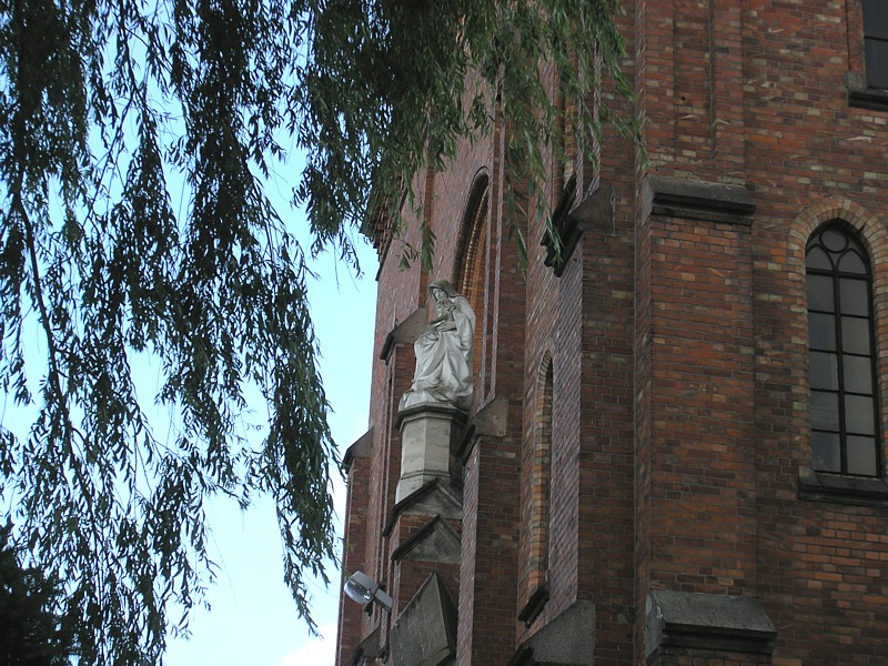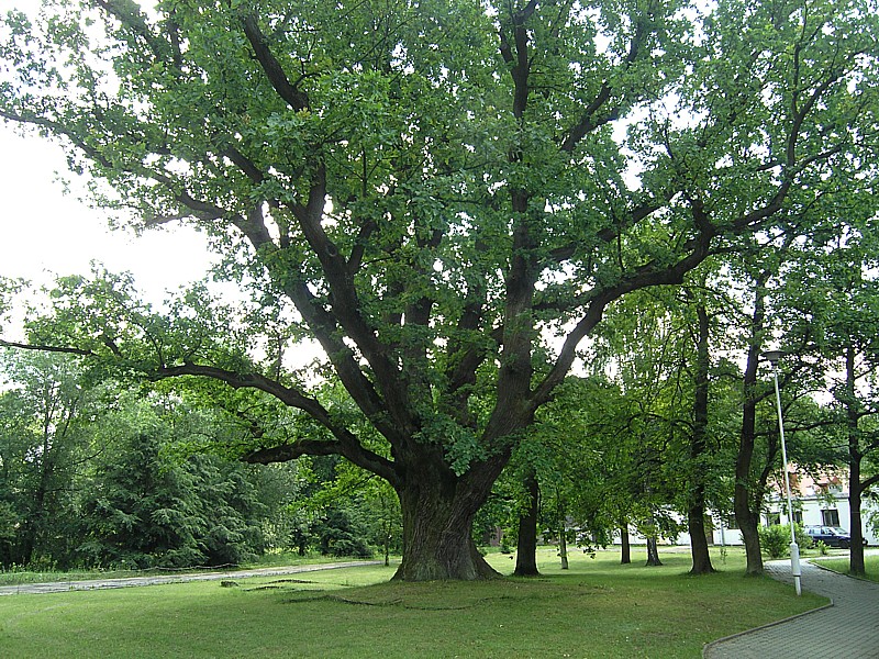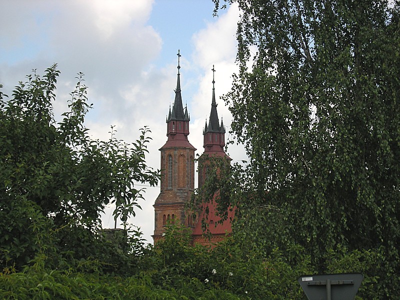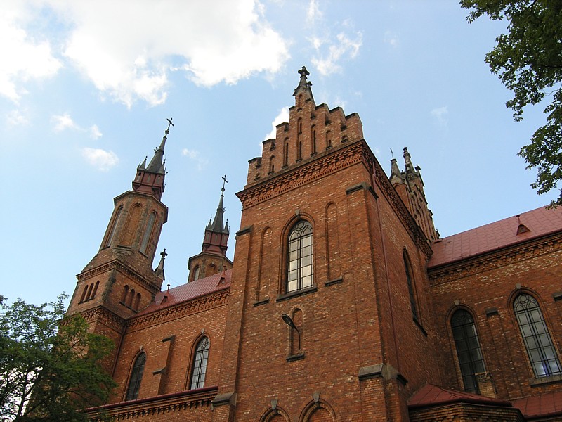 Jedziemy mało uczęszczaną asfaltówką, a potem znów w lesie za niebieskimi znakami pieszego szlaku. Mijamy miejsce walk powstańczych w 1863 r. uczczone krzyżem, pomnikiem i pamiątkowymi kamieniami. Jesteśmy w Puszczy Osieckiej, a w zasadzie pozostałościach tej niegdyś królewskiej puszczy. Zauważam rosnące tutaj bagno zwyczajne o bardzo charakterystycznym zapachu oraz borówkę bagienną. Po wyjechaniu z lasu niebieskie znaki prowadzą nas szosą do wsi Łucznica. Po lewej stronie widać zadbany pomalowany na biało budynek dawnego dworu Potockich, w którym mieści się obecnie Centrum Animacji Kultury. Chwilę odpoczywamy w cieniu ogromnego dębu szypułkowego o średnicy pnia takim, że aby go objąć potrzeba kilku ludzi. Po krótki postoju jedziemy polnymi drogami w stronę Osiecka, mijając po drodze Górki. Wokół otaczają nas wielobarwne pola i łąki. Szlak prowadzi dalej przez strugę Bełch i dalej dość niewygodnymi dla rowerzystów bezdrożami. Nagrodą jest ukazujący się naszym oczom niezwykły widok: wśród zielonych łąk na horyzoncie wielka czerwona bryła kościoła z dwoma strzelistymi wieżami, zupełnie jak okręt na oceanie. To neogotycki ogromny kościół w Osiecku zbudowany z czerwonej cegły, górujący nad doliną i kontrastujący w porównaniu z niewielkim miasteczkiem. Oprócz zadzierania głowy, aby zobaczyć wieże kościoła, zaglądamy jeszcze w głąb bijącego na ul. Zdrojowej źródła czystej wody. Woda smakuje całkiem dobrze, więc nabieramy jej do bidonów i ruszamy dalej. Przed nami jeszcze 32 km naszej trasy.