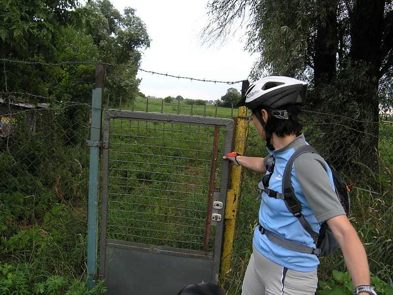 Na koniec naszej wycieczki spotyka nas jeszcze jedna podobna historia związana ze znalezieniem wyjścia. Otóż skróciliśmy sobie drogę na Gocław jadąc przez łąkę w pobliżu ulicy Kosmatki . Pamiętaliśmy, że była tu kiedyś polna droga, którą dało się dojechać na skróty. Teraz jednak przy tej nieużywanej dawno drodze stanął dom i jego ogrodzenie stanowiło kolejną przeszkodę, która trzeba było objechać. Natrafiliśmy na kolejne ogrodzenia, siatki, parkany, płoty i nie mieliśmy jak się przedostać od strony łąki na ulicę. Osiedle było widać już jak na wyciągnięcie dłoni, świat się zachmurzył i słychać było zbliżającą się burzę. Wreszcie zdesperowani i zmęczeni dotarliśmy do jakiejś otwartej furtki opuszczonej posesji. Nazwaliśmy tę furtkę drzwiami do miasta. Jeszcze tylko fragment ścieżką rowerową po osiedlu i po 12 godzinach od wyjścia rano, wracaliśmy szczęśliwie do domu dosięgnięci przez pierwsze krople deszczu. Padłam zmęczona i natychmiast zasnęłam. Śniły mi się labirynty pośród wawrzynków, ogromne paprocie i konduktor z wąsami ;-)