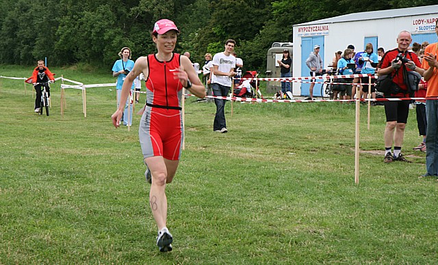 Wbiegam do boksu rowerowego i kolejny sędzia zaprasza do biegu. Zmieniam buty, zdejmuję kask i wybiegam na trasę. Luiza ostrzega mnie, żebym uważała, bo trasa biegu jest nierówna. Rzeczywiście jest poprowadzona przez wykoszony fragment łąki tuż przy plaży. Spiker coś mówi o defekcie mojego roweru i dlaczego dopiero teraz biegnę. Opowiada, że biegam od wielu lat i że na pewno zrobię te 3 km w 10 minut. Gdy przebiegam na drugiej pętli komentuje jaki mam sprężysty krok i ładną pracę rąk. Nie sposób wtedy nie biec bez powłóczenia nogami. W końcu jest meta. Nawet zbieram się do finiszu, co budzi zachwyt spikera: „skąd ta kobieta ma w sobie tyle sił?”. Wpadam w ramiona Darka, gratuluję Luizie i idziemy odpocząć chwilę na trawę. Jeszcze tylko zbieram swoje rzeczy ze strefy zmian. Rozmawiam chwilę z pakującym się obok kolegą z Poznania. Jest bardzo sympatycznie. Czekając na zakończenie imprezy zjadamy posiłek regeneracyjny w postaci grochówki. Nawet Darek jako kibic dostaje talerz. Posileni przechodzimy w pobliże bramy mety gdzie stoi przygotowane podium i są wywieszone wyniki. Najpierw dekoracja dzieci. Ola na trzecim stopniu podium wśród dziewczynek. Dowiaduję się, że Adam był w pierwszej dziesiątce w open. Kolejni nagrodzeni to juniorzy i juniorki oraz sztafety, potem kobiety open oraz najmłodszy i najstarszy uczestnik. Wśród nagrodzonych kobiet zostajemy wyczytane obydwie z Luizą i otrzymujemy medale, dyplomy oraz upominki od sponsorów. Pan wręczający nagrody jest pełen podziwu, że kobiety też wybrały taką trudną dyscyplinę jaką jest triathlon. Na koniec małe losowanie nagród. Wśród szczęśliwców są: Ola, Luiza i kolega z boksu rowerowego. W miłej atmosferze żegnamy się z gospodarzem imprezy oraz innymi uczestnikami. Spełnieni i zadowoleni wracamy do domu. Po drodze telefonuję do Sylwestra, że pływanie się udało i opowiadam przygodę z rowerem. Najbardziej jednak jesteśmy dumni z Adama, który pokazał klasę i ścigał się z rywalami jak prawdziwy sportowiec. Mój cel tez został też osiągnięty: ukończyłam pomimo przeciwności technicznych i własnych słabości. Ten start był mi bardzo potrzebny aby uwierzyć w siebie i udowodnić, że potrafię. Nawet jeśli czas poświęcony na przygotowania wydaje się być dla niektórych czasem zmarnowanym, dla mnie jest czasem który pozwala cieszyć się z pokonania wielkiej wody. Muszę jeszcze poćwiczyć szybkie zmienianie dętki w rowerze. Ta naprawa defektu razem z niepotrzebnym maszerowaniem, kosztowała mnie stratę 15 minut.