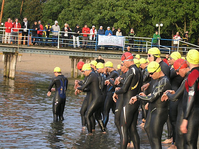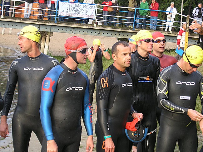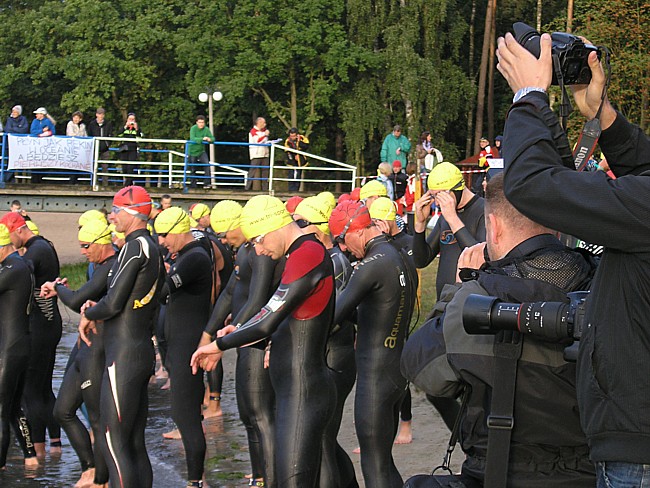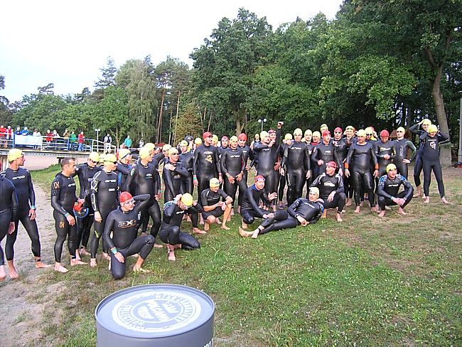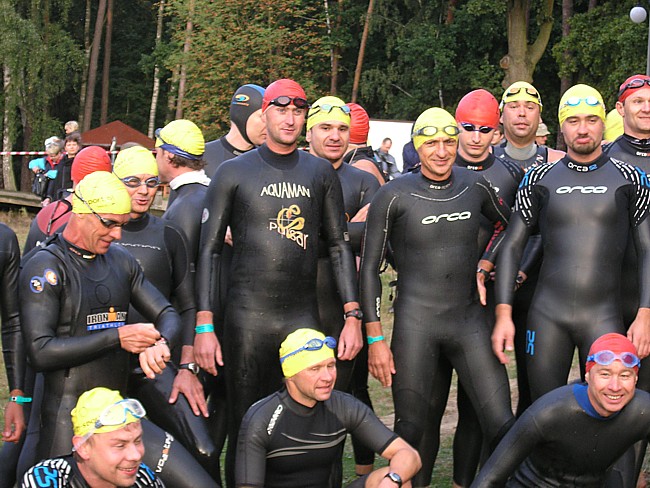 W dzień poprzedzający start mamy czas na odebranie pakietu startowego, spotkanie się z grupą warszawską i wrocławską. W planie był też przejazd techniczny trasy kolarskiej. Do czasu, gdy zapadły ciemności mieliśmy kilka podejść, każde skutecznie gaszone przelotnym deszczem. Nasze czyściutkie rowery stały więc pod dachem i mogliśmy je, przed oddaniem do boksu rowerowego, sprawdzić jedynie „na sucho”. Potem przygotowujemy zestawy na zmiany T1 i T2. Ćwiczę po raz ostatni w myślach, co po kolei będę zdejmować, a co zakładać podczas przebierania się w strefie zmian, tak aby niczego nie zapomnieć. Pakujemy wszystko do dwóch toreb opisanych numerami startowymi. Na koniec dnia wspólna kolacja makaronowa i w dobrych nastrojach kładziemy się spać. Niedziela Rano wstajemy wcześniej żeby obserwować uczestników startujących na długim dystansie. Ponad 50 osób w czarnych piankach do pływania stoi już na plaży i uśmiecha się do wymierzonych w nich aparatów fotograficznych |