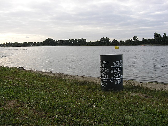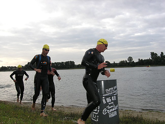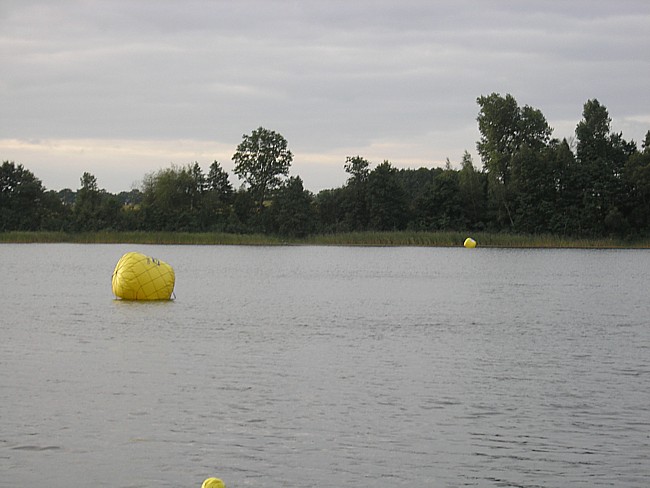 | Po pierwszej pętli pływackiej liczę wychodzących z wody i patrzę z jaką łatwością pokonują kolejne metry po obiegnięciu stojącej na brzegu beczki. W sumie mają do popłynięcia cztery pętle po trójkącie. Pierwsza boja jest bardzo duża, dwie kolejne z perspektywy brzegu wyraźnie mniejsze, ale dobrze widoczne. |