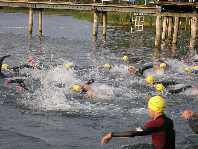 | Szukam wzrokiem Darka, który miał płynąć po mojej lewej stronie, ale nie widzę go. Płynę pomimo tego, szkoda czasu na rozglądanie się. Będąc w wodzie nie widzę drugiej boi, tylko tłum żółtych czepków rozciągniętych na znacznej przestrzeni. Nie wiadomo gdzie się kierować, bardziej na prawo, czy bardziej na lewo. W pewnym momencie słyszę: „Renia! Tutaj” i widzę wyciągniętą z wody rękę. To Darek. Super, że na mnie poczekał. Płyniemy razem. Zaczynam widzieć przybliżającą się z każdym pociągnięciem ręki boję. Świeci słońce, czuję się spokojnie. Przypominam sobie słowa Ulrike, z którą zamieniłam dziś rano kilka słów przy rowerach. Wspomnienie tej rozmowy napawa mnie dodatkową energią i optymizmem. Teraz opływamy razem boję i kierujemy się na kolejną. Zaczynam rozróżniać, co jest żółtą większą boją, a co żółtym mniejszym czepkiem i czuję się zdecydowanie pewniej w tej wodzie. Co jakiś czas podnoszę głowę i obserwuję kierunek. Dodatkowo raz na jakiś czas mam pomoc nawigacyjną w postaci głosu Darka: „Renia, dobrze płyniesz”. Zaczynam czuć, że moje ciało jest unoszone na kołyszącej fali i to coraz bardziej, im bliżej środka jeziora. Na początku jest to dosyć przyjemne uczucie. Przy nawrocie na trzeciej boi i zmianie kierunku płynięcia, okazuje się jednak, że te fale zaczynają przeszkadzać. Przy podnoszeniu głowy woda zalewa mi twarz, wlewa mi się do otwartych ust podczas nabierania oddechu. Wybija mnie to z rytmu, kilka razy muszę się zatrzymać żeby rozejrzeć się czy dobrze płynę i wyrównać oddech. Brzeg wydaje się wcale nie przybliżać, płynięcie w takich warunkach jest coraz trudniejsze i zmusza mnie do większego wysiłku. A trzeba będzie to powtórzyć jeszcze raz przy drugiej pętli. Zastanawiam się czy dam radę. Wreszcie dopływam do brzegu i wychodzę z wody, obiegam beczkę, zerkam na zegarek (27 min) i znów płyniemy. Początek już znam: będzie łatwo, potem znów odcinek z falami i walka z żywiołem. Nie jest przyjemnie, ale wiem, że to już koniec, więc macham rękoma byle szybciej do brzegu, a ostatnie metry staram się jak mogę. Łapie mnie skurcz w łydkę i próbując szybko wyjść z wody potykam się. Darek już czeka na mnie. Spiker mówi coś o sportowym małżeństwie. To chyba o nas. Po drodze do strefy zmian Darek opowiada mi, że po skończonym pływaniu czekał na mnie na brzegu, podczas gdy ktoś krzyczał żeby biegł już dalej. Wtedy on wytłumaczył, że czeka na żonę, która zaraz też dopłynie. W ten sposób zmianę rowerową także zaczniemy razem. Po dobiegnięciu do boksu rowerowego zauważam, że z rowerem wybiega na trasę przebrana już Luiza. Ja mam przebieranie jeszcze przed sobą. | |