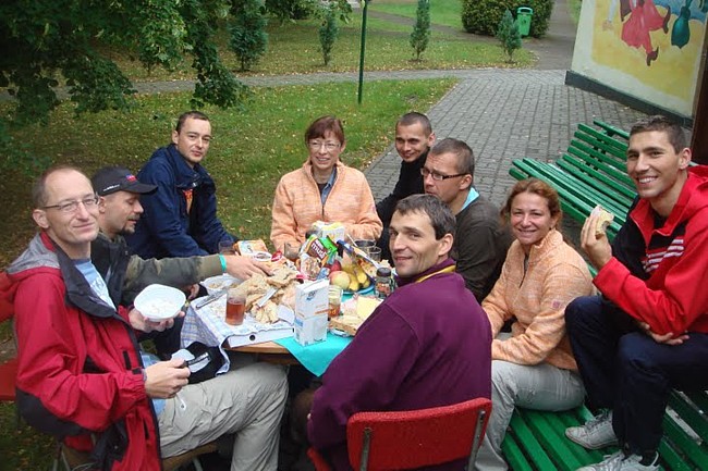 | Przy stoliku wystawionym przed domek pomieściło się kilka osób. Wspominamy wczorajsze przeżycia i analizujemy wyniki. Po śniadaniu spotykamy się w sali gdzie było pasta party. Zebranie prowadził DS. Za stołem prezydialnym siedzą przedstawiciele Zarządu: Sylvia, Adam i Przemek. Jest poważnie, bo i o poważnych sprawach jest mowa: rejestracja Stowarzyszenia i zasady jego działania. Jest też uwieńczenie rywalizacji w ramach wewnętrznego Grand Prix IM2010. Nagrodzeni zostają wszyscy, którzy zgłosili swoje osiągnięcia. Dla wszystkich są dyplomy, a nagrody od sponsora odżywek sportowych, dla trójki pań i panów z najmniejszą ilością punktów w klasyfikacji, której zasady zna chyba tylko Adam prowadzący wszystkie skomplikowane obliczenia. | |