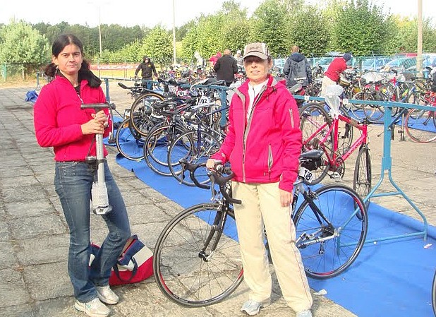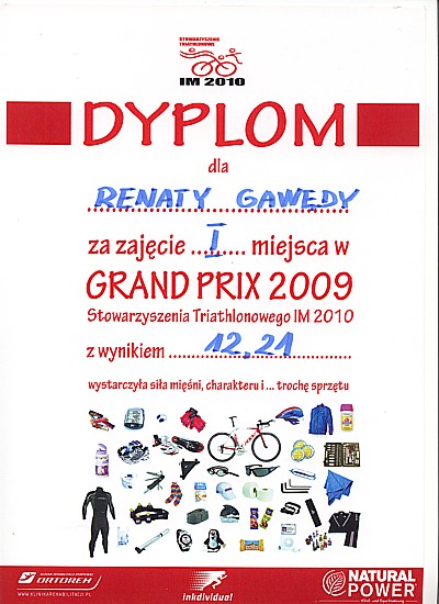 Podziękowania dla wszystkich, którzy zaangażowali się w projekt, w tym dla Kajetana z Wrocławia, który poświęcił swój czas na wykonanie projektów naszych strojów startowych. Widzieliśmy jak to się przełożyło na siłę grupy rozpoznawalnej podczas zawodów. Z żalem żegnamy się i aby przedłużyć miłe chwile wybieramy się jeszcze nad jezioro popływać. Jest słonecznie, nie ma wiatru, a tafla wody jest spokojna. Czyż taka pogoda nie mogłaby być wczoraj? Darek popłynął na drugi brzeg, bo czuł niedosyt pływania po wczorajszym rekreacyjnym tempie na trasie pływackiej, gdy zajmował się asekuracją mnie. Ja pływałam odpoczynkowo przy brzegu, obserwując kaczki. Na brzegu suszyli się i przebierali po pływaniu Ania, Luiza z Olą i „Rybkowie”. W drodze powrotnej zatrzymujemy się jeszcze na wspólny obiad. Zamówiliśmy solidne porcje jak na triathletów przystało. Kolejne pożegnanie i każdy wsiada do swojego auta. Po jakimś czasie znów czuję się głodna, więc zatrzymujemy się przed dużym sklepem na zakupy. Mam ochotę na owoce, więc kręcimy się w alejkach z warzywami i owocami. Jakoś dotrwaliśmy do końca podróży, ale na kolację znów pochłaniamy po dwie słodkie bułki z rodzynkami. W domu oglądam jeszcze raz medal z zawodów i dyplom z GP. Na dyplomie jest napis o tym, że do uprawiania triatlonu oprócz chęci i siły potrzebne jest jeszcze trochę sprzętu. To racja. Wniesienie tych wszystkich toreb, plecaków i siatek zajęło nam trzy kursy chodzenia po schodach. Logistyka wyjazdów na imprezy triathlonowe jest dużo bardziej skomplikowana niż na zawody biegowe. Jest za to ciekawiej. Już następnego dnia szukamy z Darkiem innej imprezy tri, planując starty na wiosnę przyszłego roku. Triatlon w Gratz, St. Poulen czy Moritzburgu? A jesienią oczywiście start w Borównie. |