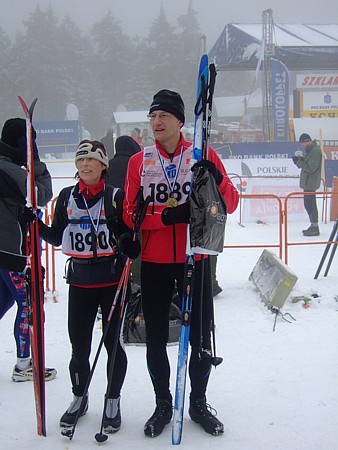 | Wróciliśmy już do domu z medalami. Dziękujemy wszystkim za trzymanie kciuków, były bardzo potrzebne. Trasa Biegu Piastów była wymagająca w tym roku, ze względu na trudne warunki pogodowe. Specyfika Biegu Piastów polega na tym, że jest to impreza masowa, w której wziąć udział może każdy, nawet gdy ma pierwszy raz deski na nogach (przykładem jest Pit). Dlatego, w zasadzie nie są to zawody (może za wyjątkiem pierwszej setki), liczy się ukończenie. | |