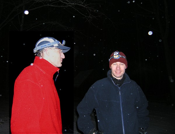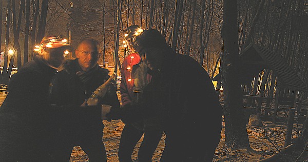 | Las rozświetliły fajerwerki, to była przygotowana przez Piotrka niespodzianka, z której wszyscy bardzo się ucieszyliśmy. Po takiej rozgrzewce z przyjemnością przebiegliśmy 6 km przez ośnieżony las. | |