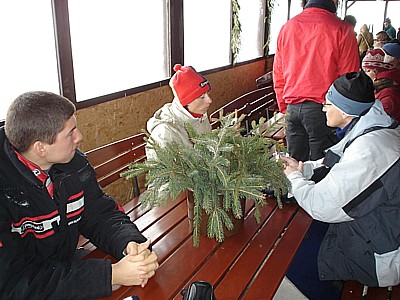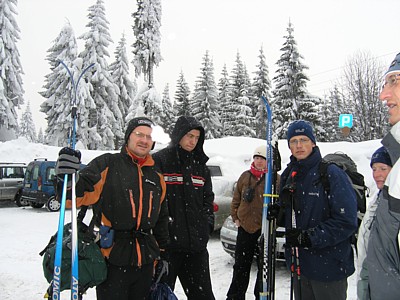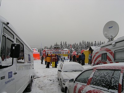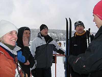 Witamy się z nimi bardzo serdecznie po czym idziemy w stronę domków biura zawodów: Bombik, Renka i Grocik do szatni, a my już przebrani odebrać narty z serwisu zostawione tam już we czwartek (dobrze, że nie musimy stać teraz do smarowania nart w kolejce). Wracając z nartami na parking widzimy już samochody i autobusy stojące na poboczu drogi, na parkingach nie ma już dla nich miejsca.