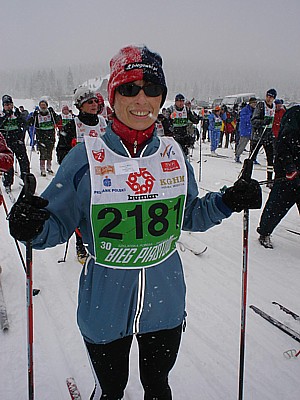 Ja odruchowo też włączyłam stoper, ale za chwilę okazuje się, że to był tylko start dla tych co biegną na 50 i 30 km. Spiker ogłasza, że my musimy jeszcze czekać. Przepuszczamy z boku biegaczy biorących udział w Biegu Leśnika i dalej się tłoczymy – tak mija 6 minut. W końcu puszczają i naszą grupę. Posuwamy się bardzo wolno do przodu, najpierw narta za nartą, potem ścisk rozluźnia się, jest lekki podbieg i już ktoś się przewraca, lekki zjazd i znów ktoś leży. Gubię już na samym początku Darka, który postanowił trzymać się Costello. Jestem osaczona przez kijki i narty innych ludzi, otaczają mnie ze wszystkich stron. Pomna opowieści o połamanych nartach i kijach już na starcie, uważam aby wyjść cało z tego tłumu. Wreszcie jest kawałek prostej z torami, co prawda w większości już mocno rozjechanymi, ale można już próbować biec w miarę normalnie, odbijając się z narty i odpychając kijkami. W pewnym momencie jakaś kobieta przede mną przewraca się robiąc salto z nartami i gubi przy tym kijek; ja też tracę równowagę i leżę zupełnie niespodziewanie na boku. Jestem bardziej niż zdziwiona, bo wyobrażałam sobie, że pierwszego bałwana zaliczę na jakimś zjeździe, albo na bardziej karkołomnym odcinku trasy, a tu okazuje się, że dzieje się to na zupełnie prostym i łatwym odcinku. Nie tracę jednak czasu i zabieram szybko narty z toru, żeby następni za mną mieli wolną drogę i wstaję. Słyszę jeszcze kurtuazyjne „Czy może mi ktoś podać kijek?” (zauważam kątem oka, że to ta pani od salta), ale ja jadę już dalej. Teraz wyprzedzam raz z prawej, raz z lewej strony i idzie mi gładko, w końcu to fragment trasy bardzo dobrze znany z naszych wcześniejszych wycieczek. Widzę przed sobą gęstniejący tłum, który wcale nie porusza się naprzód. Dotarliśmy do punktu gdzie jest łącznik tras - bardzo stromy odcinek pod górę. Niektórzy zdejmują tutaj narty i idą na nogach, większość jednak podchodzi jodełką. Miejsca jest tylko dla jednej osoby, ale oczywiście są amatorzy na doczepkę, którzy właśnie teraz próbują swoich sił wyprzedzając bokiem. Robi się z tego spora przepychanka, słychać okrzyki zdenerwowanych narciarzy: „Weź pan ten kijek stąd!”, inni uspokajają „Spokojnie, wszyscy zdążą”. Za tym trudnym podejściem jest lekki zjazd, ale też i kolejne choć nieco łagodniejsze podejście. Po tym odcinku specjalnym grupa największych maruderów wykrusza się i przede mną są już tylko tacy, którzy jadą podobnym tempem jak ja. Trzymam się więc tej grupy i dojeżdżamy do kolejnego rozdroża, a od niego znów zaczyna się długie, ale łagodne podejście. Wydaje mi się, że stawiam nartę za nartą, ale wszystkim idzie też tak wolno, dobrze że zaraz jest krótki zjazd, na którym można odpocząć. Za zakrętem znów jeszcze jedno bardzo długie podejście, najpierw w lesie, potem przez polanę (to już chyba Górny Dukt Końskiej Jamy). Na szczycie podejścia wyjmuję z kieszonki kurtki żel, nie zatrzymując się wyciskam go i jadę dalej. Zauważam znów kobietę w szarej bluzie, którą zapamiętałam ze startu i starałam się jej nie tracić z oczu przez większość trasy, teraz trzymam się jej zupełnie blisko. Zbliżamy się do punktu odżywiania na Polanie Pod Cichą Równią, udaje mi się w czasie jazdy złapać kubeczek z ciepłą i słodką herbatą. Po żelu i herbatce odzyskuję całkowicie siły. Teraz już będzie tylko w dół (Dolnym Duktem Końskiej Jamy). Nie czuję żadnego zmęczenia, wyprzedzam kolejnych narciarzy, ale numeru startowego pani w szarej bluzie jakoś nie widzę. Za to pojawia się zielony maszt, to znak że już całkiem blisko do mety. Patrzę na zegarek: czas 1 h 18 min. Jestem już w torach na finiszu, wydłużam krok i widzę, że na końcu jest tabliczka meta dla 30 km, mam moment zawahania i wtedy zaliczam mały upadek, ale szybko się podnoszę i już nie patrząc na nic wjeżdżam na metę. Dostaję medal i wpadam na cieszącego się Darka czekającego już na mnie od 15 minut na mecie.