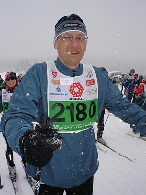 bo to właśnie dzięki niej zaczęła się nasza fascynacja nartami biegowymi, no i te finezyjne, pisane jakby od niechcenia posty Dropsa na forum. Żal nam się rozstać z Dropsem, ale idziemy przebrać się do samochodu by wrócić znów na metę. Przy barierkach mety kibicuje Drops, który szczególnie dopinguje przebiegającym kobietom, pewnie wypatrując swoich pań będących jeszcze na trasie. Patrzy też z niepokojem na chmury zasłaniające słońce. Potem spotykamy przebranego już Costello, który skończył bieg kilka minut przed Darkiem. Rozpoznajemy się z Damkiem, który przyszedł kibicować razem z żoną.