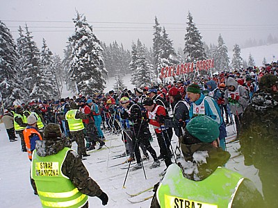 Na polanie są boksy oznaczone tabliczkami z kolejnymi numerami startowymi (ale to tylko dla tych co biegną na 50 km/30 km, czyli dla zawodników z czerwonymi numerami). Miejsce startu na 10 km jest oznaczone zieloną tabliczką i znajduje się na samym końcu polany za wszystkimi boksami (nasze numery są zielone i zaczynają się wszystkie od 2000). Po wejściu do właściwego boksu, porządkowy przekreśla flamastrem nasze numery (rozumiem, że to jest właśnie ta „weryfikacja zawodników przed startem” z regulaminu). Teraz będziemy czekać pół godziny na start. Stoimy więc stłoczeni obok siebie, na tyle na ile pozwalają narty. Wtedy przypominam sobie o nartach: muszę przecież wpiąć narty. Najpierw prawa - oj coś nie da się zapiąć, próbuję więc z lewą – ok. udało się. Walczę ponownie z prawą, po kilku próbach wreszcie i druga narta jest zapięta. Teraz jestem już spokojna. Jeszcze głos spikera, który wszystkich pozdrawia, my podnosimy kijki grotami do góry, uderzamy jeden o drugi i też wołamy „Hej”. Gdy robi to ponad 2 tys. narciarzy to hałas jest przejmujący. Wreszcie widać na niebie spadającą „gwiazdę”, to rakieta z wystrzału startera, którego tutaj na końcu nie słychać. Teraz widzimy przed sobą tłum narciarzy, który drgnął i pnie się do góry, to ruszył początek peletonu.