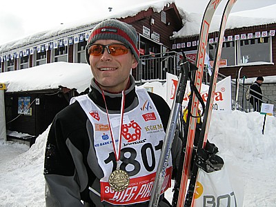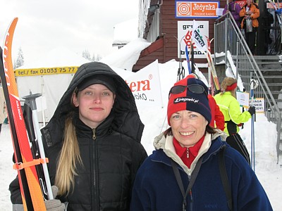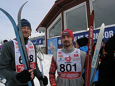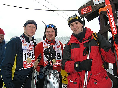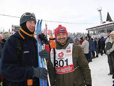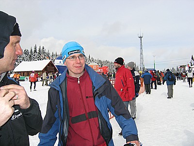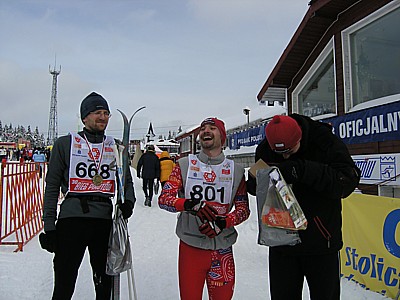 Opowiadają jak było na trasie, jak biegli obok siebie przez kilometr i dopiero się zorientowali, że obaj są forumowiczami, gdy pozdrowił ich kibicujący na trasie Majkel (inny forumowicz). Stojąc tak wspólnie i rozmawiając widzimy jak na skuterze jadą ratownicy medyczni z defibrylatorem, jak się później okazało ratować jednego z narciarzy, który zasłabł na trasie, niestety pomoc była bezskuteczna. No cóż przy tak dużych imprezach zdarzają się i takie sytuacje. My natomiast zupełnie nieświadomi wówczas czego jesteśmy świadkami, rozmawiamy dalej o wyczynach Dziunka, pokazującego nam buty, które dostał od zawodniczki, która wygrała w nich zawody