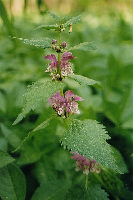 . jasnota plamista (Lamium maculatum) rodzina wargowe – liście trochę przypominają pokrzywę zwyczajną, ale u jasnoty nie są parzące (często spotyka się też jasnotę białą o kwiatach barwy białej)