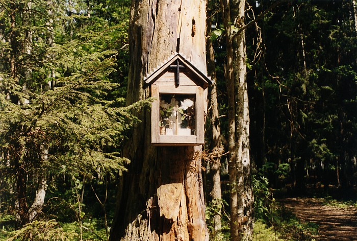 kapliczka na pniu suchej sosny nazywanej „Świętą Sosną” – to początek szlaku czarnego – ścieżki edukacyjnej po 700 m kładce prowadzącej przez fragment boru bagiennego (starodrzew sosnowo-świerkowy)