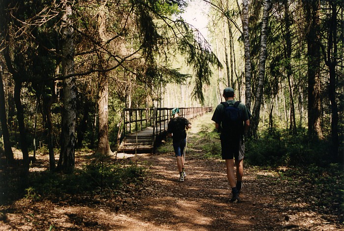 dojście do kładki ścieżki edukacyjnej, wzdłuż której umieszczone są tablice z opisem torfowiska wysokiego i jego typowej roślinności: bagno zwyczajne, borówka bagienna, modrzewnica zwyczajna, wełnianka pochwowata)