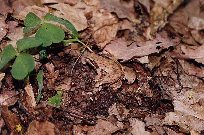 . trójlistkowe liście, jak u koniczyny należą do cieniolubnego szczawika zajęczego (Oxalis acetosella) z rodziny szczawikowatych; uważny obserwator dostrzeże też na zdjęciu upodobnioną do leśnej ściółki żabę