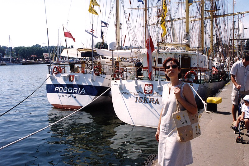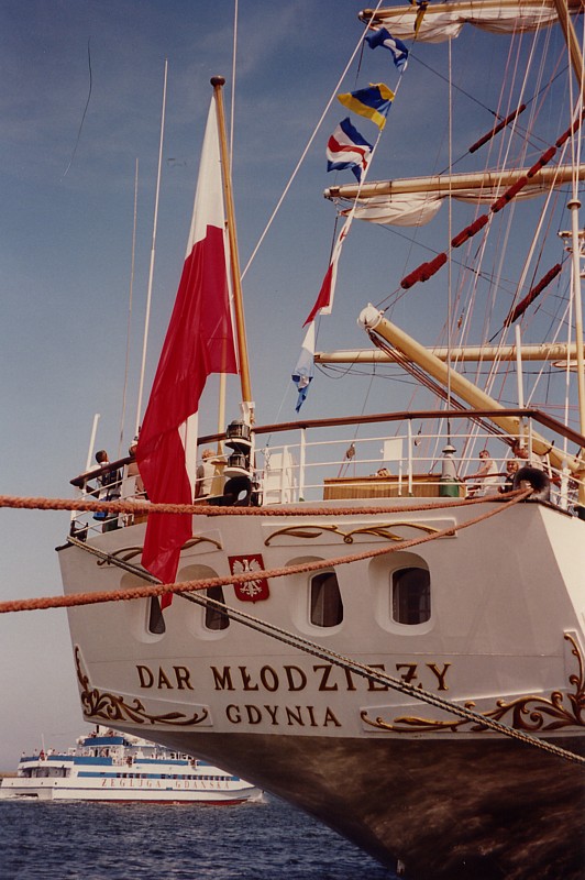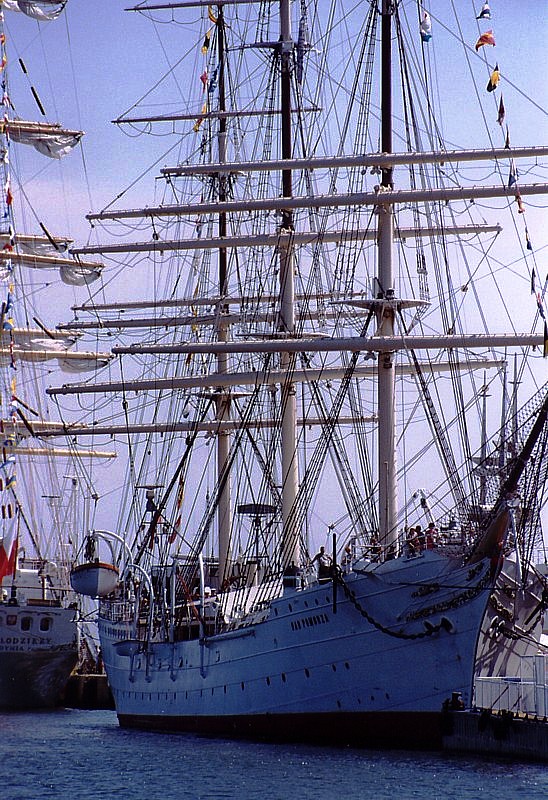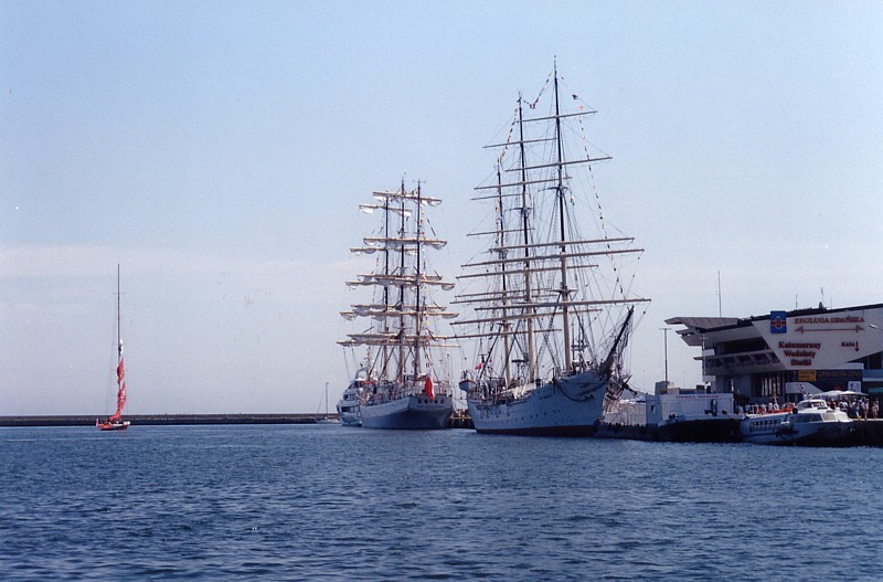 W porcie Żeglugi Gdańskiej okręt-muzeum Dar Pomorza, który nie brał udziału w regatach, w głębi za nim fregata Dar Młodzieży (długość 109 m, klasa A) zbudowana w 1982 r.