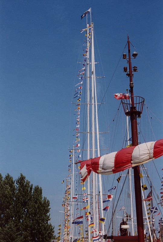 przy zwiniętych żaglach na postoju w porcie uwagę przykuwa kolorowa wielka gala flagowa
