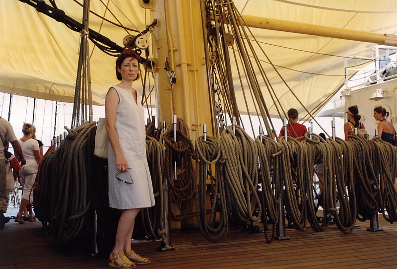 zwoje fałów na pokładzie barku Siedow, kręcą się młodzi matrosi, słychać rosyjski język, można było wejść na pokład, pewnie po to aby przyciągnąć potencjalych chętnych do przeżycia przygody życia, czyli rejsu tym monumentalnym żaglowcem, który w ten sposób zarabia na swoje utrzymanie