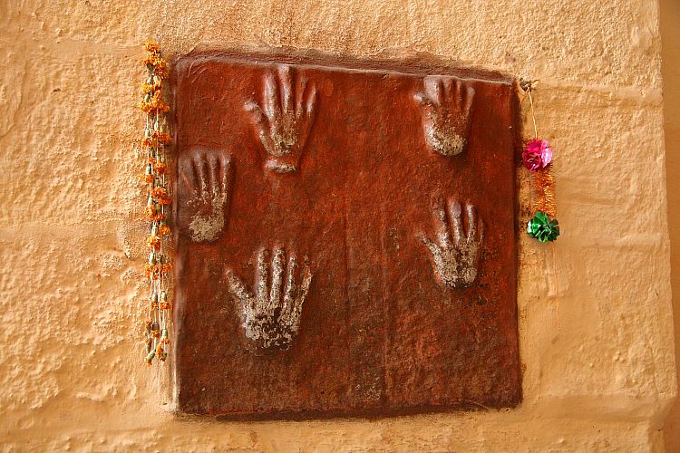 Dłonie żon maharadży idących na stos sati razem ze zmarłym maharadżą.