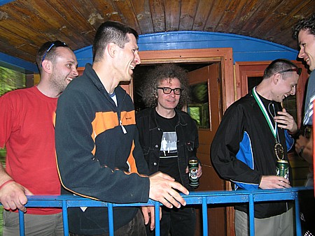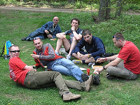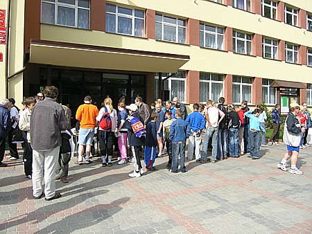| Czuję się jak prawdziwa zawodniczka. Za metą czekają już uradowany Darek i Konrad. Gratuluję Szpaqowi, który wbiegł tuż za moimi plecami oraz czekającemu na niego Damkowi. Robimy sobie wspólne zdjęcie z Grażynką Witt i Ojlą, która za chwilę też dotarła, zadowolona że też zrobiła dziś „życiówkę”. Potem jemy ciasto, chwilę czekamy na wodę i pyszny obiad, a organizatorzy przepraszają, że nie nadążają, ale nie spodziewali takiej ilości biegaczy, impreza rozrasta się z roku na rok. Po posiłku idziemy do szkoły, gdzie są prysznice. Przebrani i w bardzo dobrych nastrojach udajemy się na dekoracje zwycięzców dzisiejszego biegu. | |