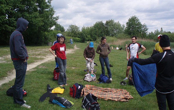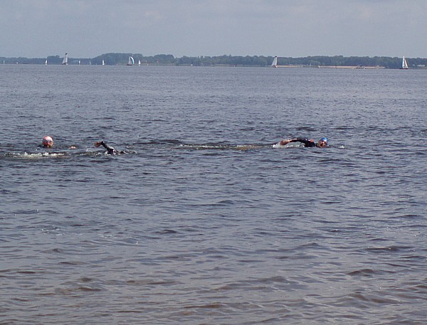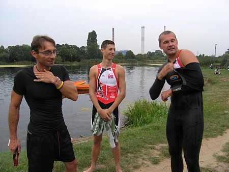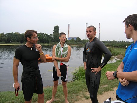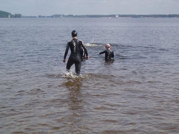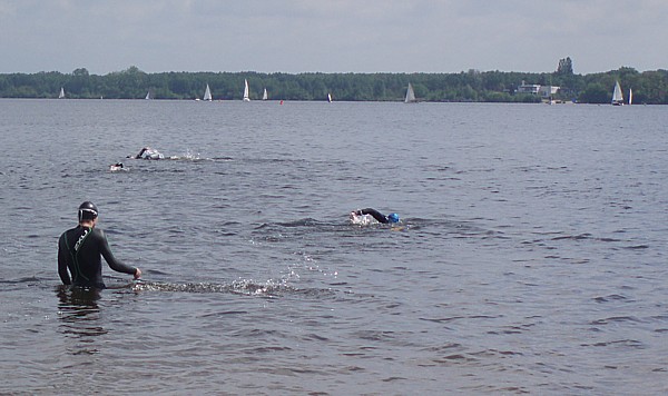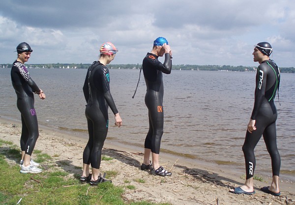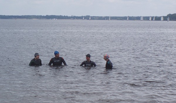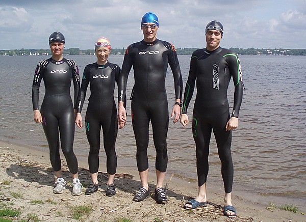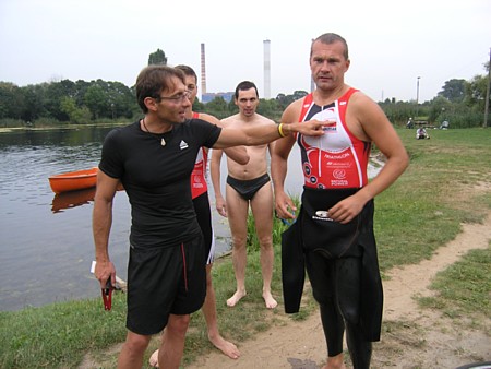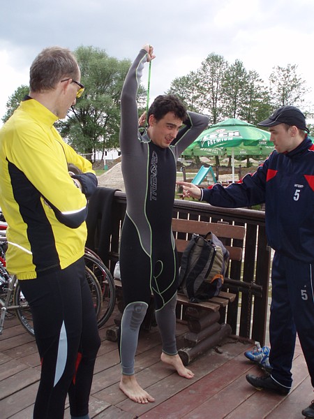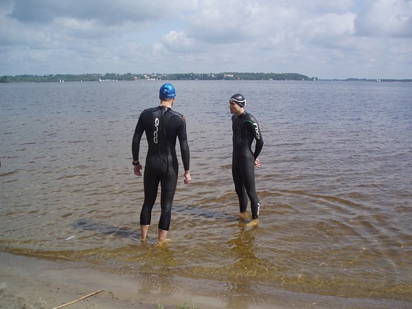 | Ktoœ by pomyœla³, ¿e tak nam siê spodoba³o p³ywanie w zimnej wodzie Zalewu Zegrzyñskiego, ¿e w kolejn¹ majow¹ niedzielê postanowiliœmy wybraæ siê znów na p³ywanie w jeziorze. Powód jednak by³ nieco inny. To nie przyjemnoœæ moczenia siê w wodzie, ale koniecznoœæ nauki nawigacji przyci¹gnê³a nas nad jeziorko w Gliniankach w Zielonce. Nawigacjê najlepiej jest bowiem æwiczyæ w warunkach naturalnych. Nie jest to sztuka ³atwa, ani mo¿liwa do wykonania na basenie, gdzie czarna linia na dnie oraz ograniczaj¹ce tor liny, nie u³atwiaj¹ wcale tego zadania, a wrêcz przeciwnie: p³ynie siê jak po sznurku. Nawigacja jest jednak kluczowa podczas p³yniêcia w wodzie otwartej, a takie warunki bêdziemy mieæ na prawie ka¿dej imprezie triathlonowej. Zatem æwiczymy nawigacjê. Kandydatów do æwiczeñ tego dnia by³o sporo: | |