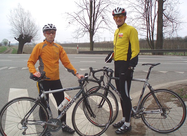 | Wreszcie został dokonany ostateczny wybór i Darek stał się szczęśliwym posiadaczem rogatego przedstawiciela ze stajni Kellys. Pomimo, że z sobotniego słońca pozostało już tylko wspomnienie, a niedzielne niebo zasnute ciężkimi i ciemnymi chmurami, ruszyliśmy odważnie naszą ulubioną drogą nr 17. Początek bardzo budujący. Nasze ubiory i tempo stawiały nas wśród pozdrawiających się jadących z naprzeciwka kolarzy. Powrót, niestety w coraz większym deszczu oraz przy odczuwalnym spadku temperatury, nie był wcale szybszy niż się spodziewaliśmy. Wizualizacja sauny i gorącej herbaty w termosie czekającym tuż przy Zakręcie nadały jednak sens naszym ostatnim kilometrom.
