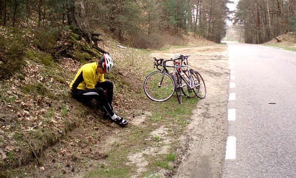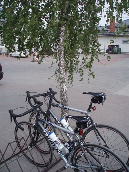 | Z niedzielnej wspólnej wycieczki DAR-u z Luizą zrobił się trening interwałowy między chmurami. Ledwo dojechaliśmy do Falenicy gdy złapał nas pierwszy tego dnia deszcz. Darek postanowił zawracać, wkrótce po tym jak ochlapał go przejeżdżający obok samochód. Na szczęście blisko była stacja benzynowa, na której trochę podeschliśmy, popijając kawę. Jednak plan dojechania do Kącka wziął w łeb. Widząc kolejne chmury kłębiące się na niebie definitywnie wracamy w kierunku Warszawy. Przemykamy się lokalnymi bocznymi uliczkami, podziwiając przy okazji podmiejską niską zabudowę. Po drodze jeszcze jeden przymusowy postój po daszkiem w oczekiwaniu na przejście kolejnej ulewy, by zakończyć wycieczkę znów w strugach deszczu. To była próba generalna naszej wytrwałości na jazdę w "pełnym zanurzeniu". | |
