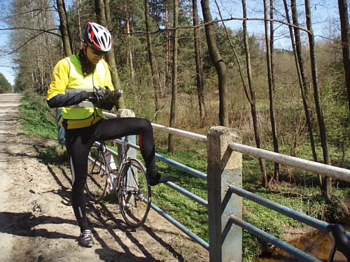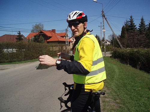 | Poranek w Niedzielę Wielkanocną spędziliśmy z mapą "Okolice Warszawy wschód" w kieszeni. Darek pracował już jakiś czas temu nad trasą. Pogodę mieliśmy nie najgorszą: o 7 rano było 10 st. Brak słońca wskazywał, że temperatura nie podniesie się drastycznie w ciągu najbliższego czasu dlatego wróciliśmy się po cieplejsze rękawiczki zakrywające palce. Kurtki miały nas chronić od wiatru (ja testowałam dziś swoją nową, jeszcze nie używaną). Ruszamy we trójkę: Luiza, Renata i Darek. Jedziemy Wałem Miedzeszyńskim w stronę Otwocka. Dalej cały czas prosto, mijamy po drodze Karczew i dojeżdżamy do Otwocka Wielkiego. Teraz musimy skręcić w odpowiednią drogę, która doprowadzi nas do Glinek. Za Glinkami na licznikach mamy 35 km. | |