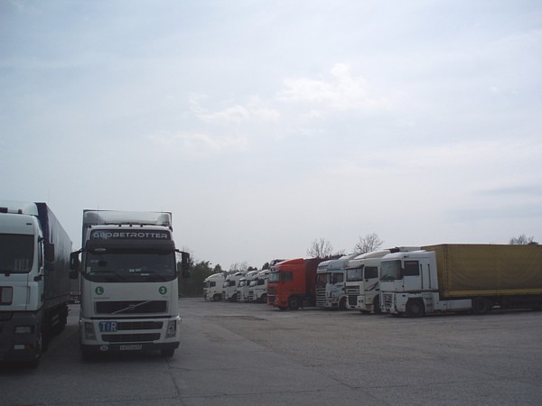 Potem docieramy do tego ponurego miejsca gdzie parkuje mnóstwo tirów i musimy ok. 1 km przejechać drogą nr 50, bardzo nieprzyjemny fragment naszej trasy. Czy nasze kruche rowery miałby jakiekolwiek szanse? |