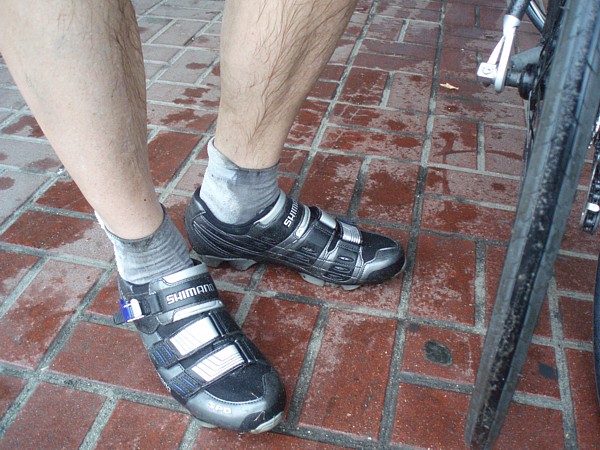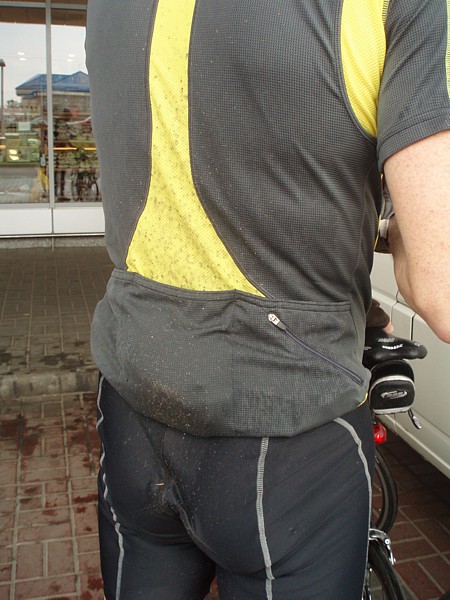 | Z daleka już było słychać drogę nr 17, trochę się już ucieszyłam, bo to oznaczało, że do domu mamy blisko, a niebo mocno zachmurzone i tylko patrzec jak spadnie deszcz. Zatrzymujemy się jeszcze na stacji benzynowej uzupełnić napoje, gdy błysnęło się i spadły pierwsze krople. Nie tracimy jednak rezonu, w końcu zostało nam tylko 20 km prostej drogi. Na początku jest nawet całkiem fajnie. Wkrótce jednak okazuje się, że ciepły deszczyk zamienia się w strugi deszczu, buty nabierają wody, woda kapie z kasku, okulary zachlapane i zaparowane (przydałyby się wycieraczki), ubranie przemoczone, a my stajemy się z każdym kilometrem coraz bardziej brudni od chlapiącej spod kół wody z kurzem i piachem. Piach skrzypi mi nawet między zębami. Teraz dwa zdjęcia dokumentujące straty po przejechaniu takiego małego odcinka. Wszystko nadawało się do intensywnego prania. O rowerach nie wspomnę. Takie uroki zabawy w deszczu. | |